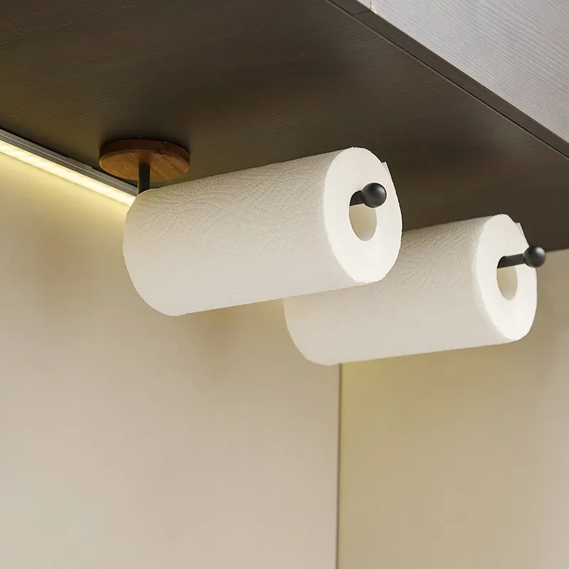 ウォールマウント式くるみの木製キッチンペーパー収納ラック - 穴あけ不要!多機能でラップも収納できる便利な壁掛けシェルフ。キッチンをスッキリ整理して、スタイリッシュな空間を演出!