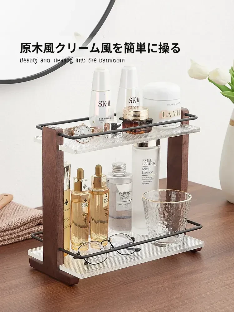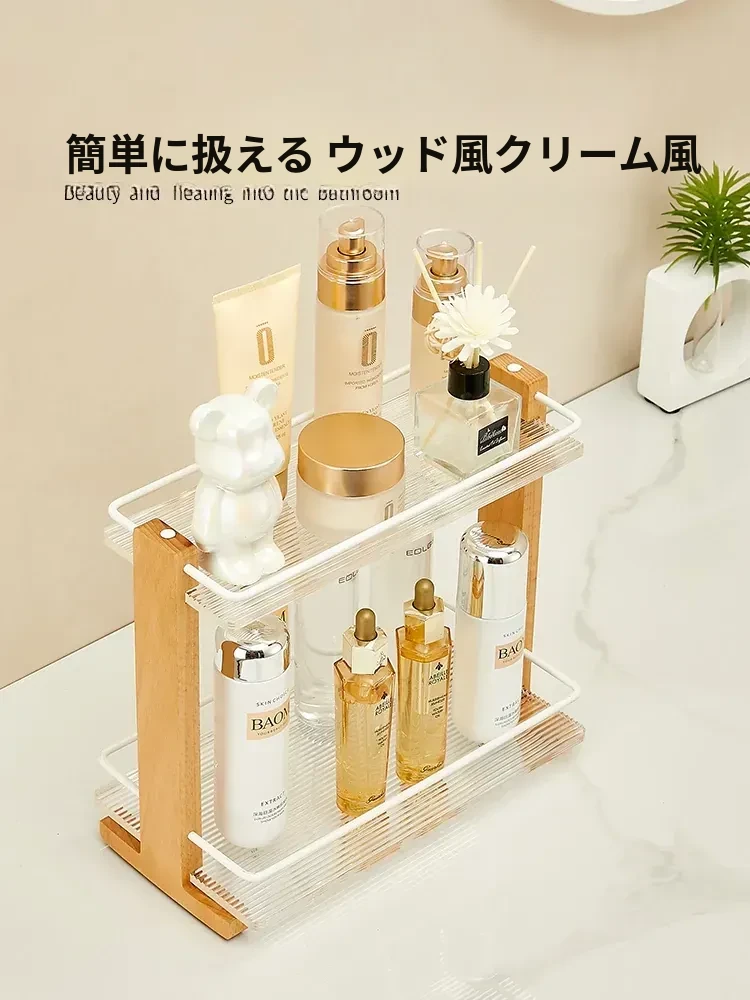 洗面台の化粧品整理ボックス - アクリル製でスタイリッシュ!デスクトップ収納ラック、多層木製デザインで、バスルームやドレッサー周りをスッキリ整頓。あなたの美しさを引き立てるアイテムです!