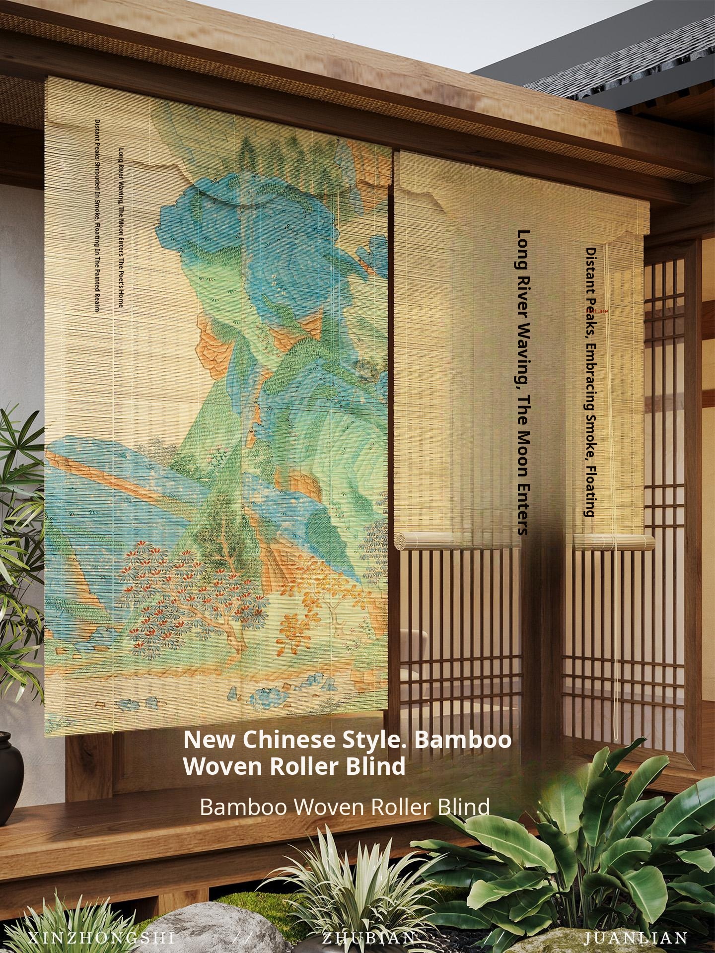 Song Dynasty Aesthetic Bamboo Roll Curtains - New Chinese Zen Style Bamboo Woven Shades for Tea Rooms, Light-Blocking, Sun-Shading, No Drilling Required Room Dividers and Window Curtains.