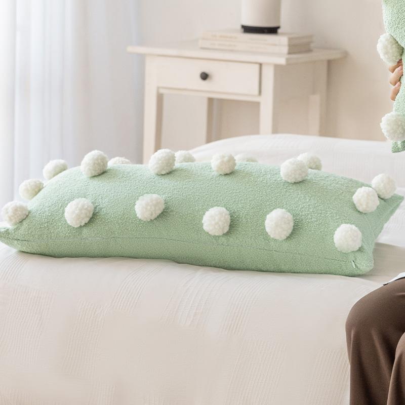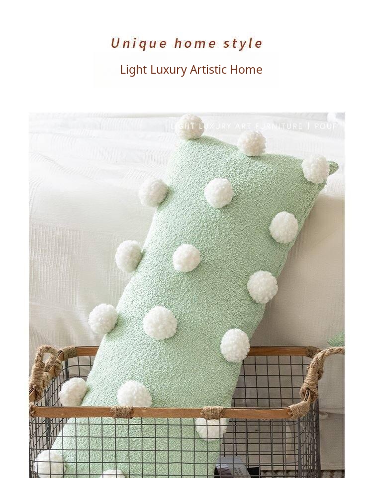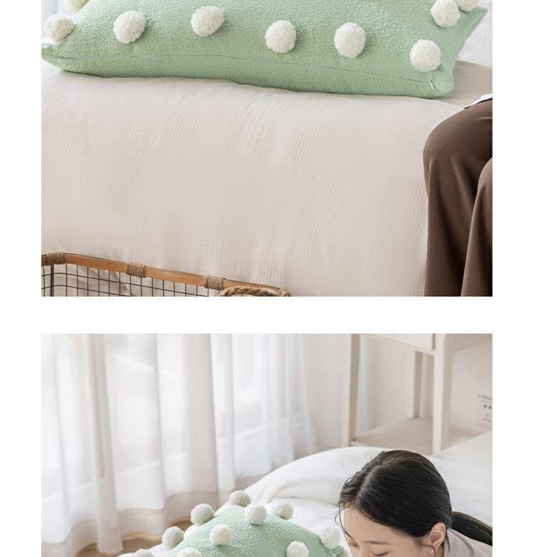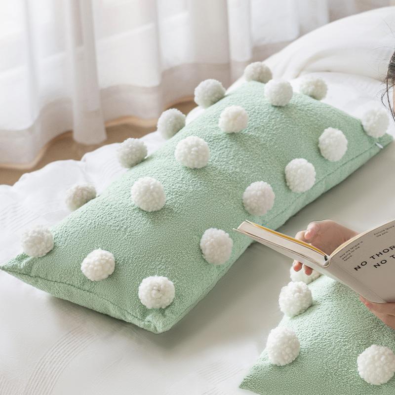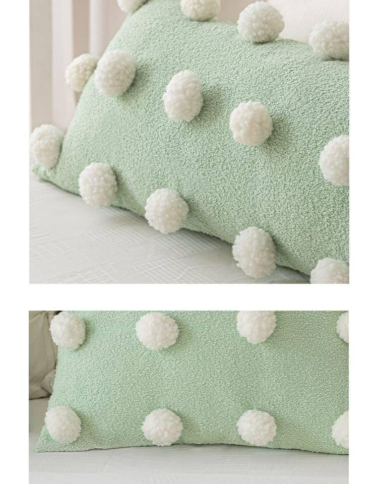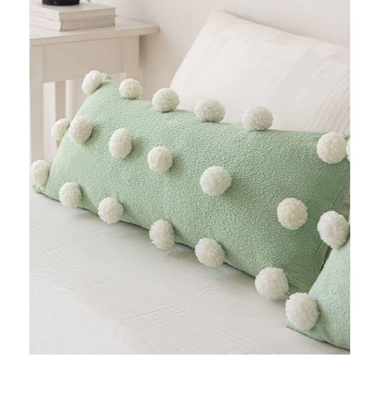 Cute Matcha Green Tea Pom Pom Long Pillow Cover for Sofa - Luxurious Accent Cushion for Living Room and Bedroom, Perfect for Back Support and Cozy Decor
