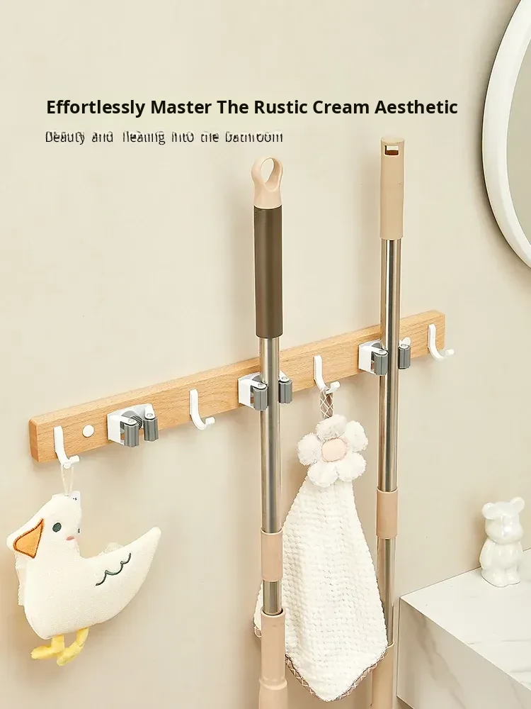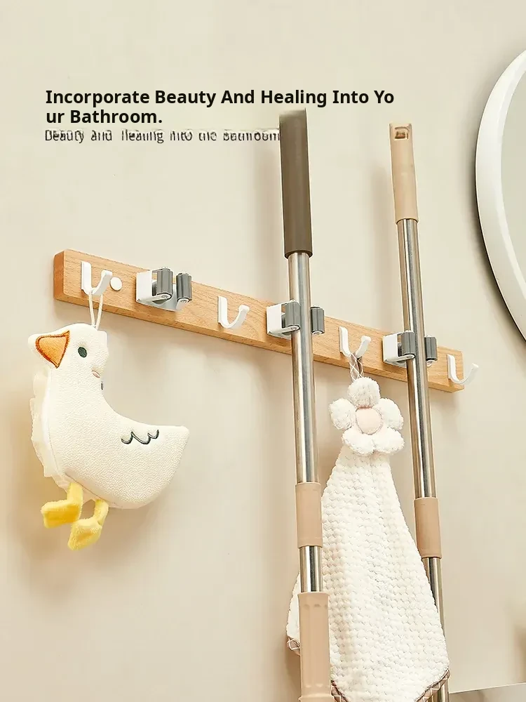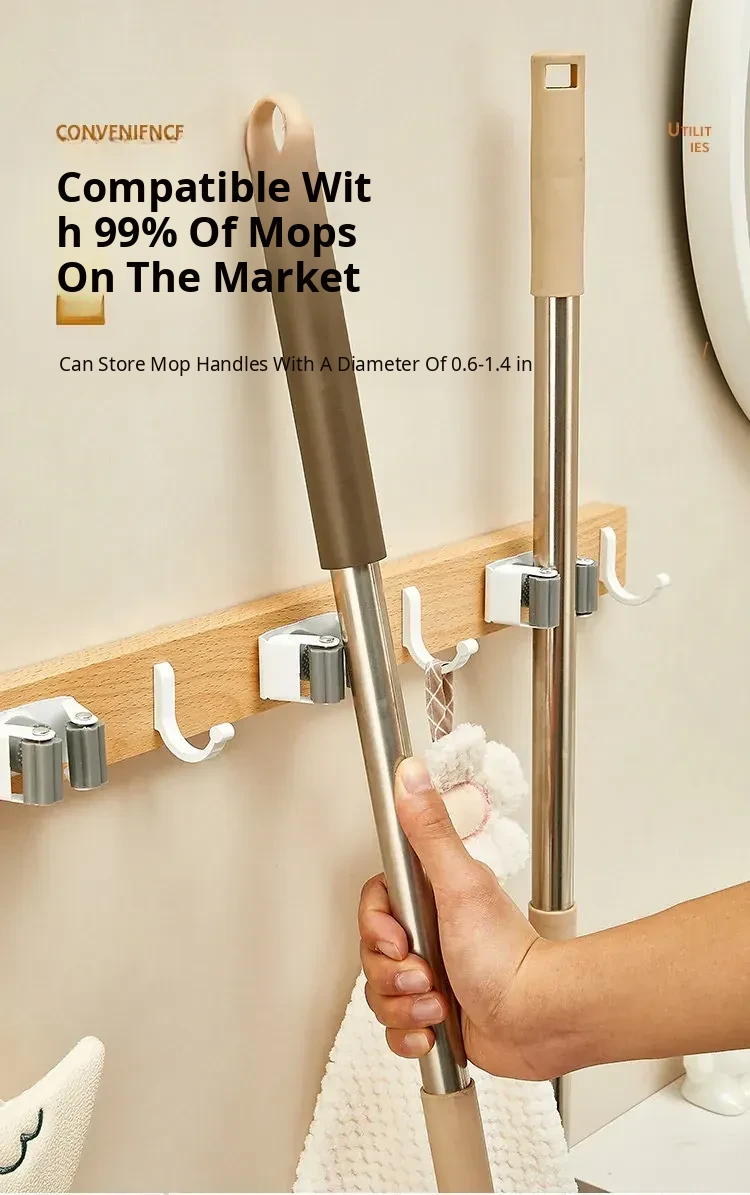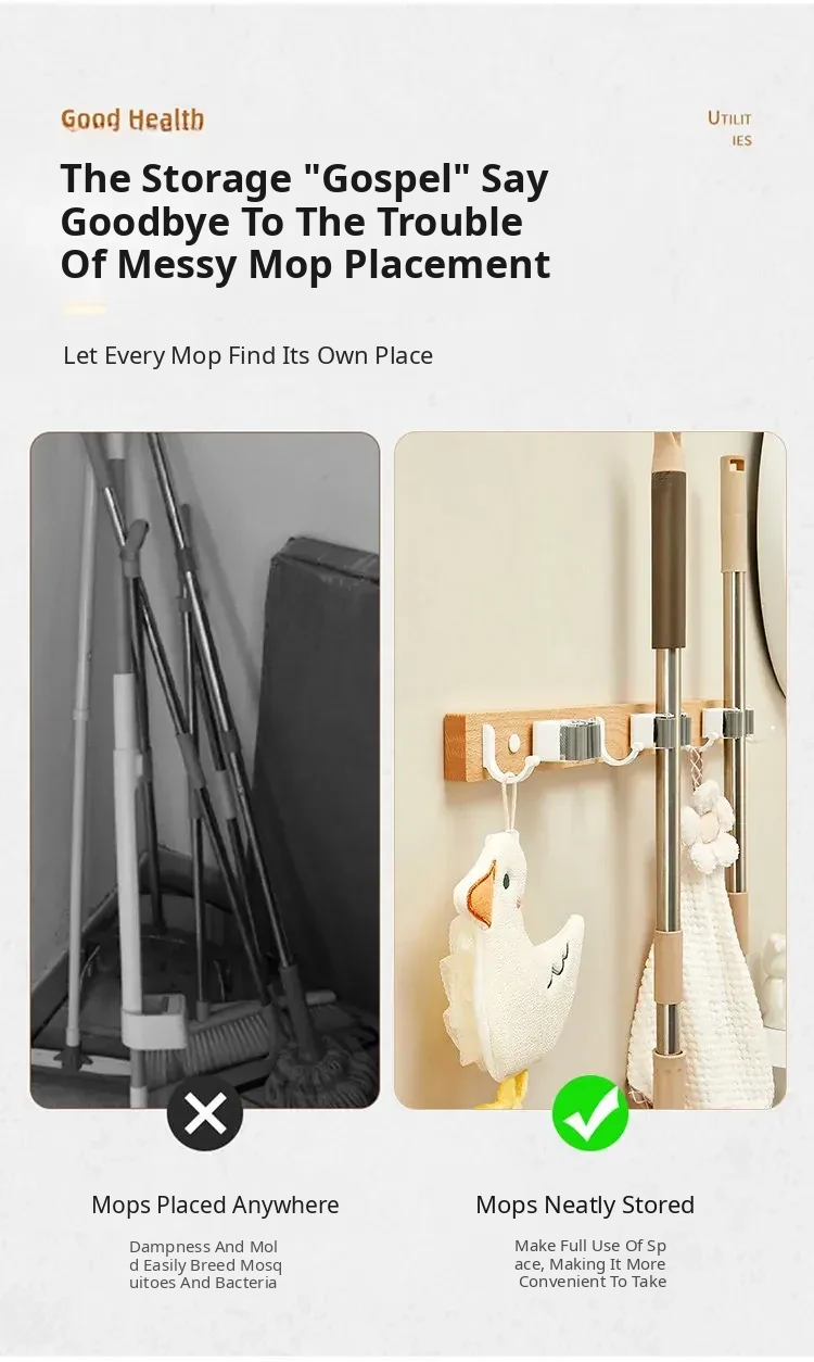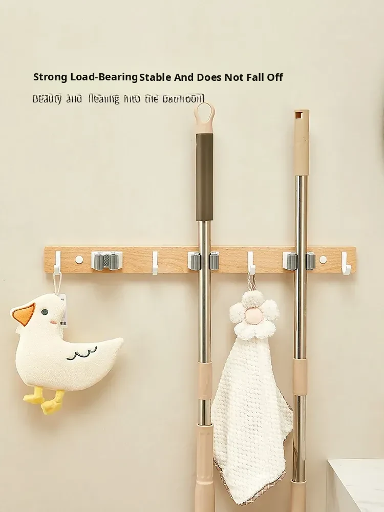 Wall-Mounted Mop Holder with Strong Adhesive - No Drilling Required! Perfect for Organizing Brooms in Bathrooms - Sturdy Wooden Design for Maximum Durability and Style.