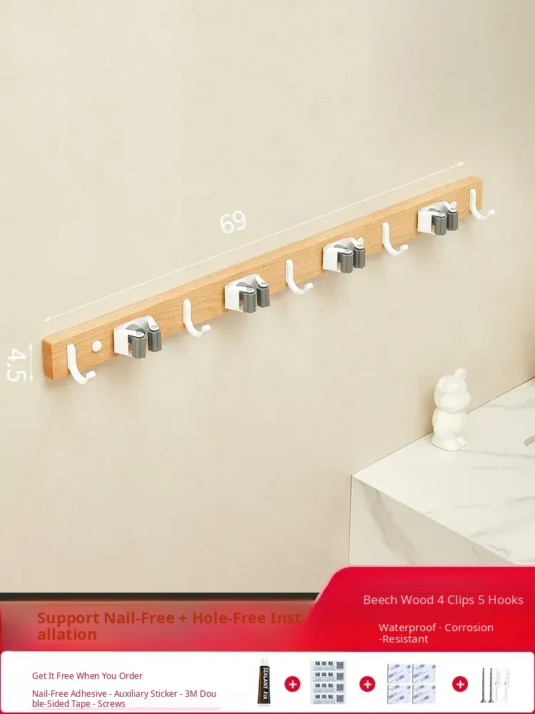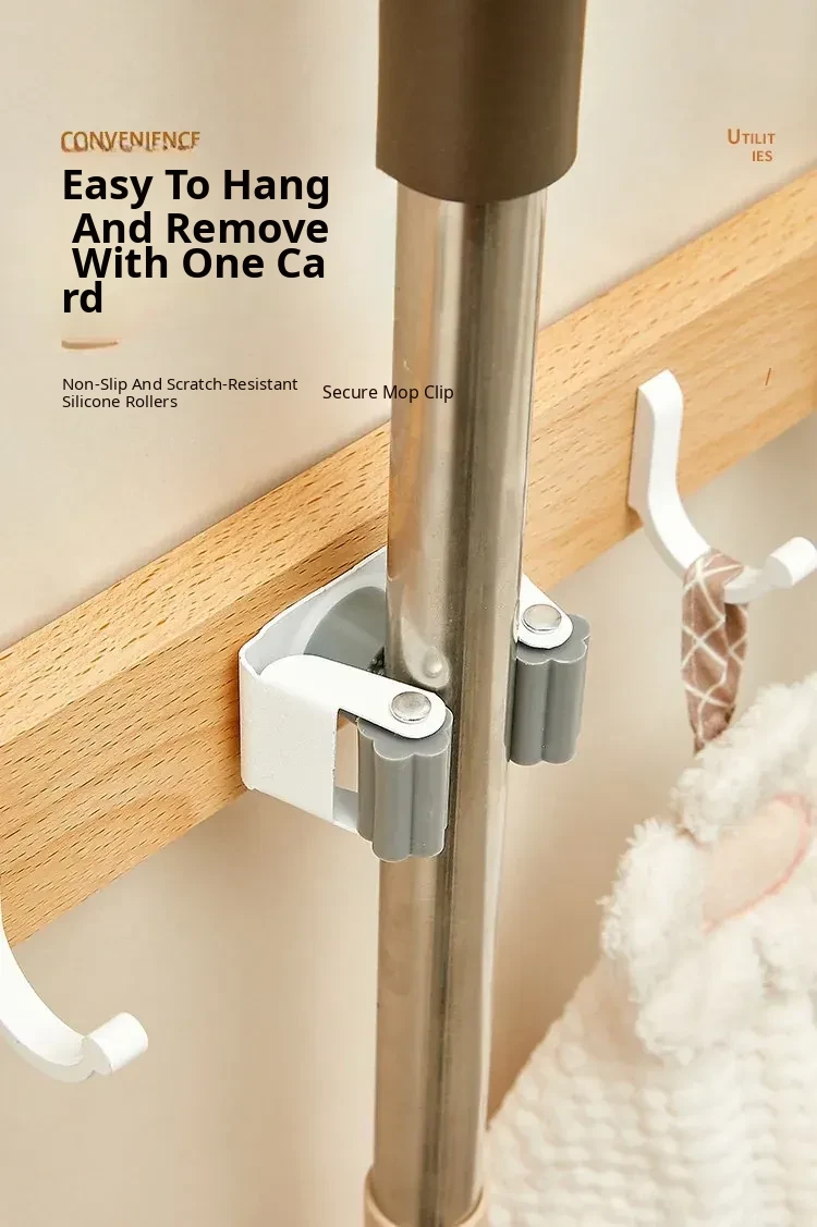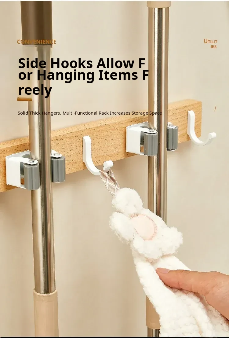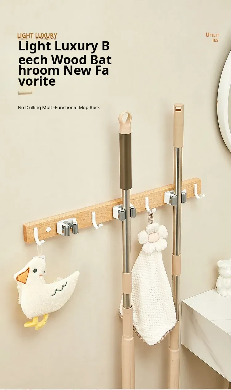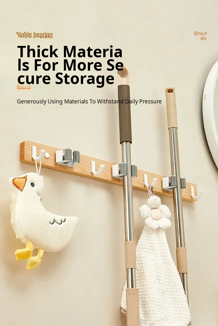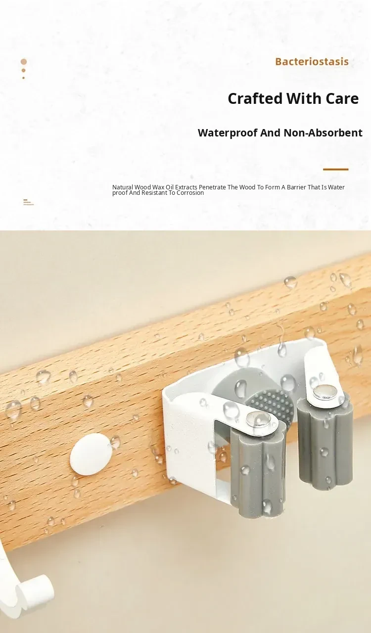 Wall-Mounted Mop Holder with Strong Adhesive - No Drilling Required! Perfect for Organizing Brooms in Bathrooms - Sturdy Wooden Design for Maximum Durability and Style.
