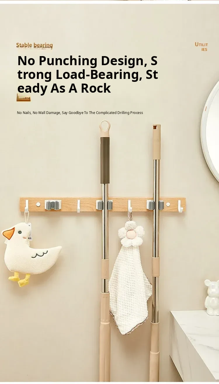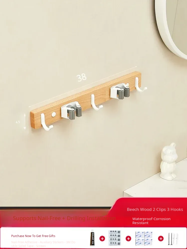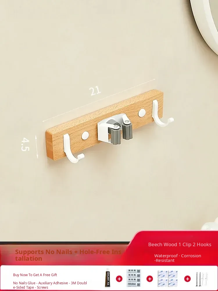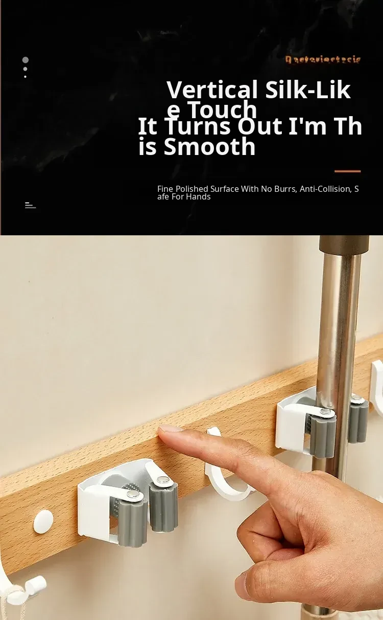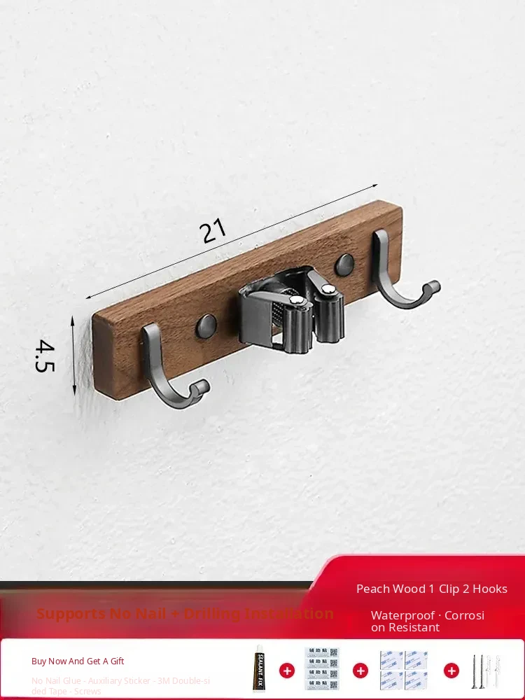 Wall-Mounted Mop Holder with Strong Adhesive - No Drilling Required! Perfect for Organizing Brooms in Bathrooms - Sturdy Wooden Design for Maximum Durability and Style.