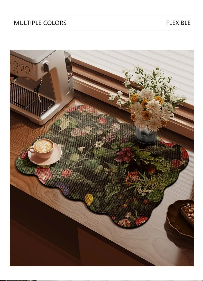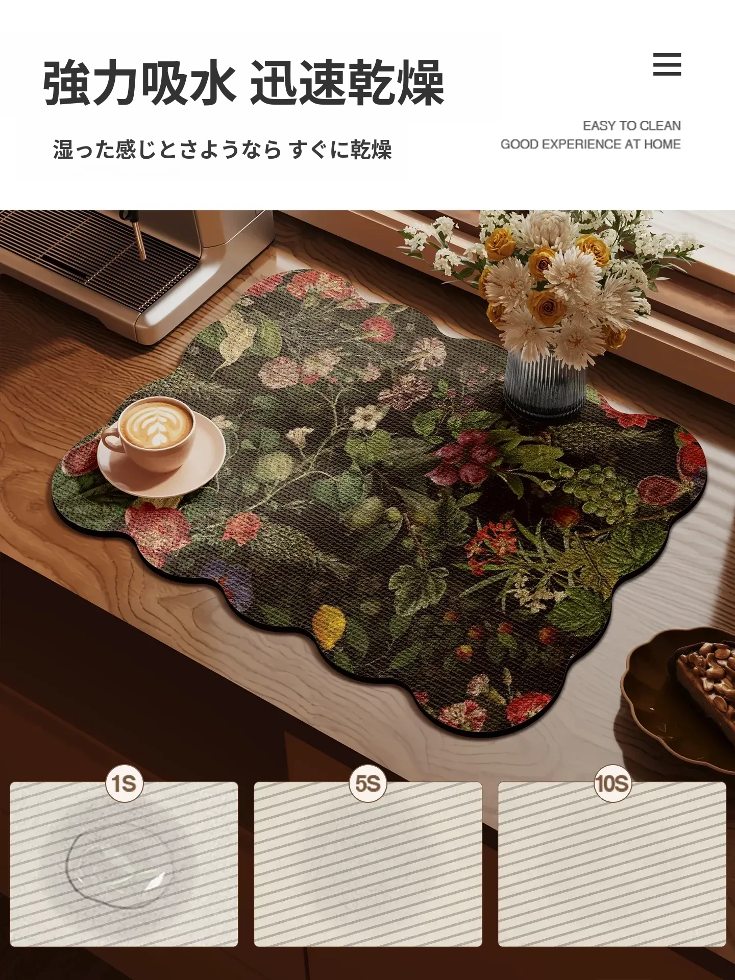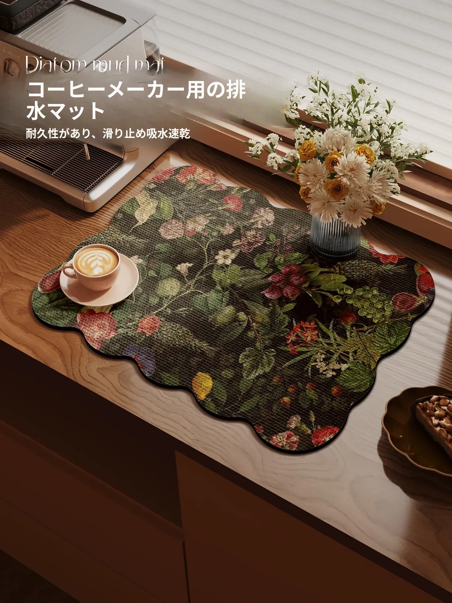 キッチン用吸水マット!コーヒーメーカー専用の水切りマット。テーブルやバーカウンターにぴったりな小型マット。熱を防ぎ、テーブルを守る必需品!