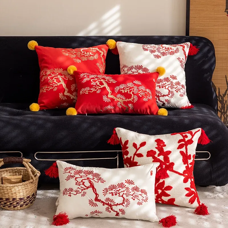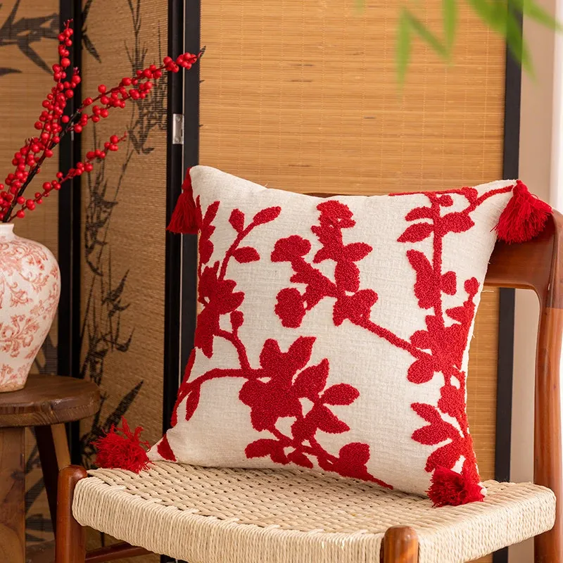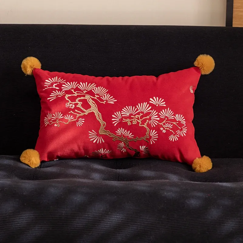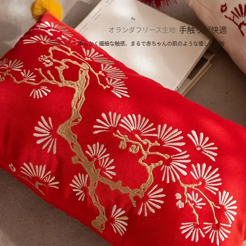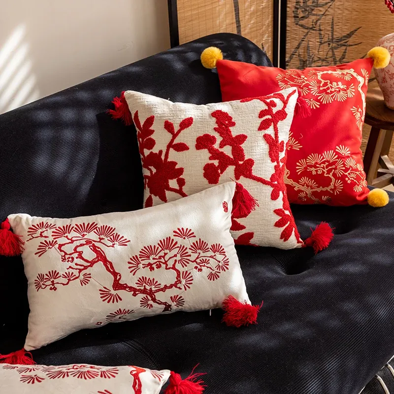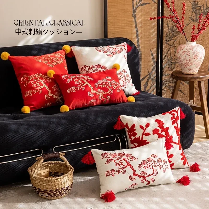 新中式赤紅刺繍クッションカバー|高級感漂う国風デザイン|リビングソファや寝室の窓辺に最適な背当てクッション|美しいインテリアを演出するアイテム!