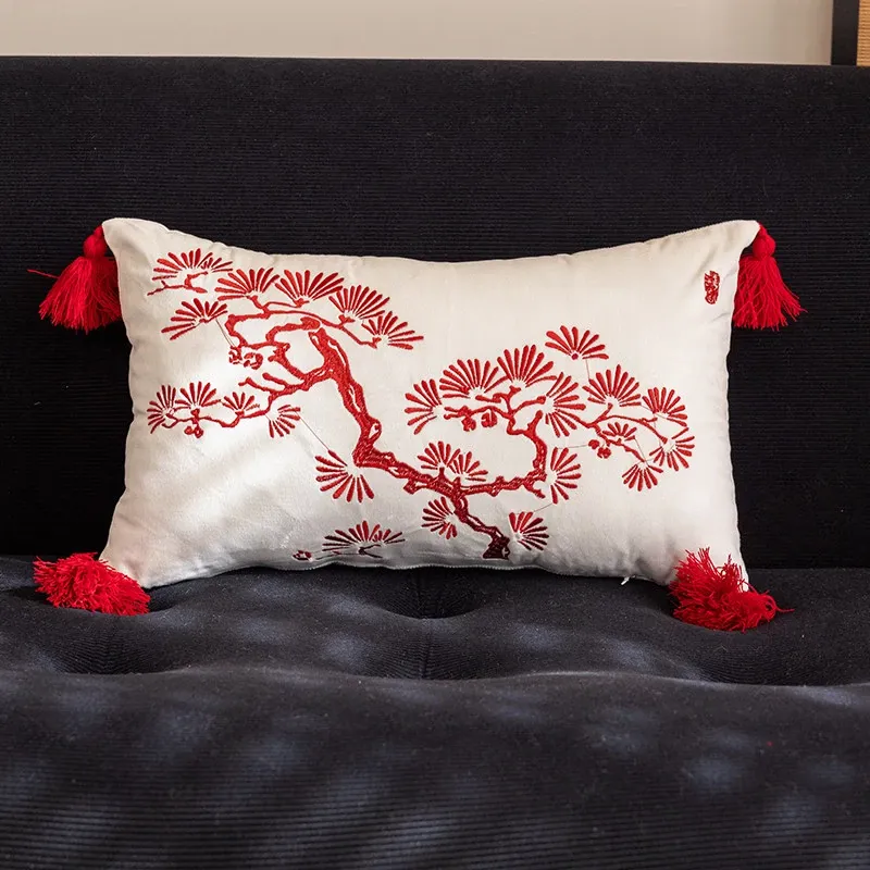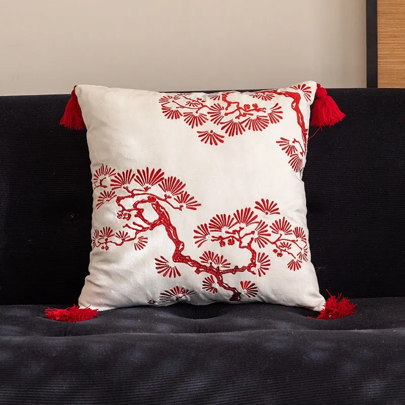 問松柏レッドストライプベルベット刺繍クッション