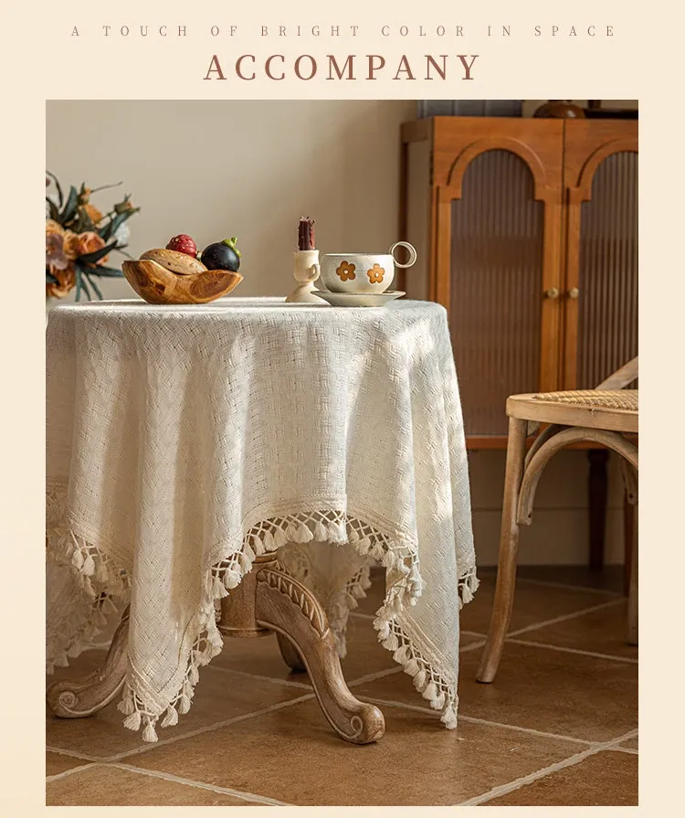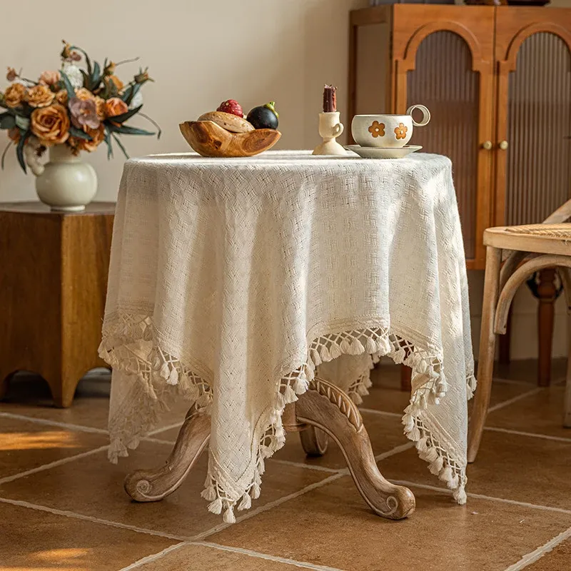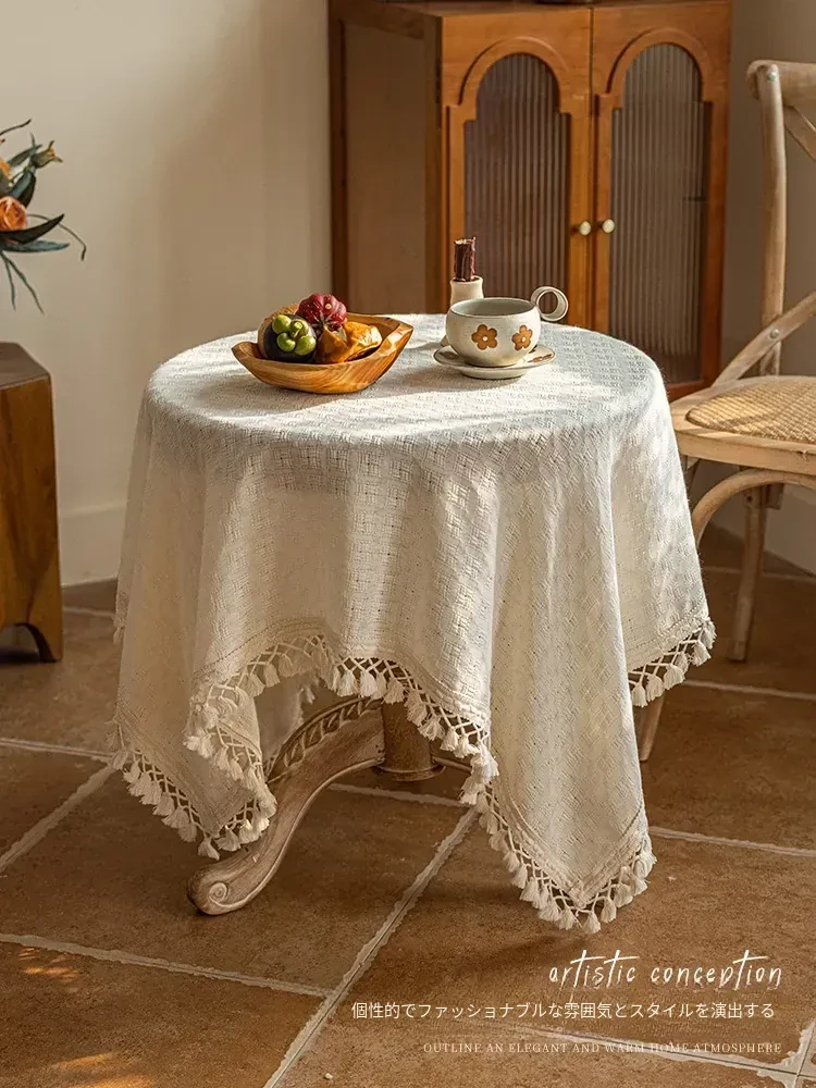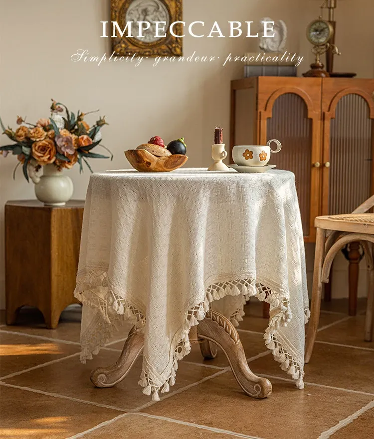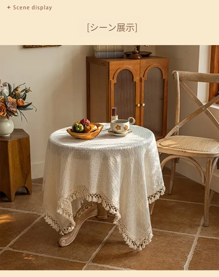 フレンチインスピレーション ベージュフリンジ ラウンドテーブルクロス 高級感溢れるモダンデザイン 小さなティーテーブル用カバー でおしゃれな食卓を演出!