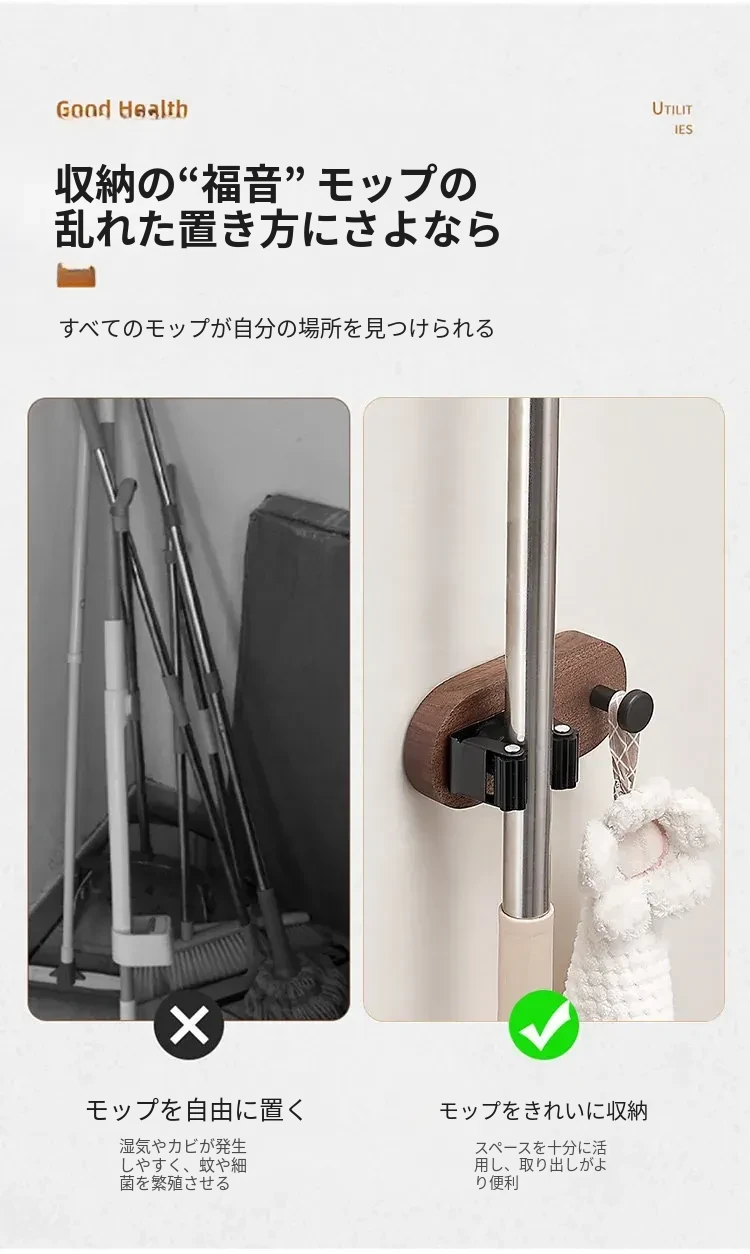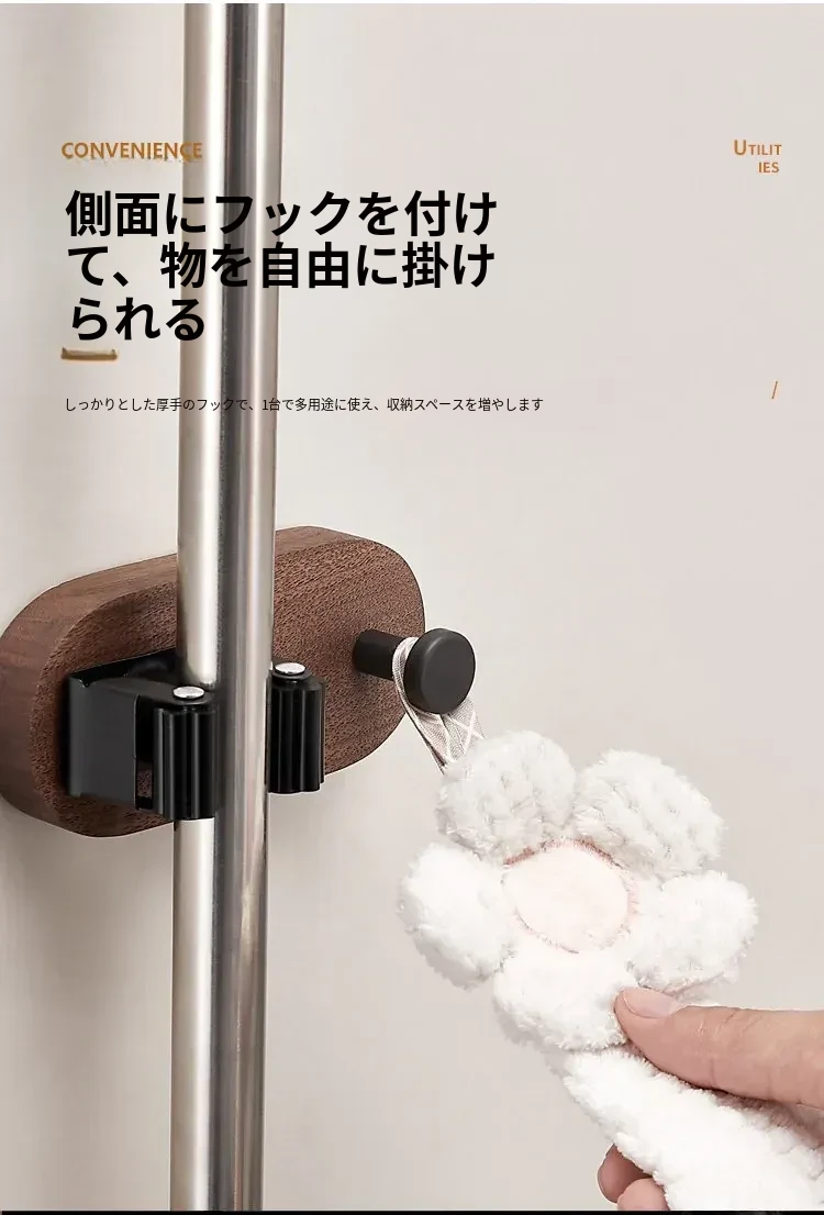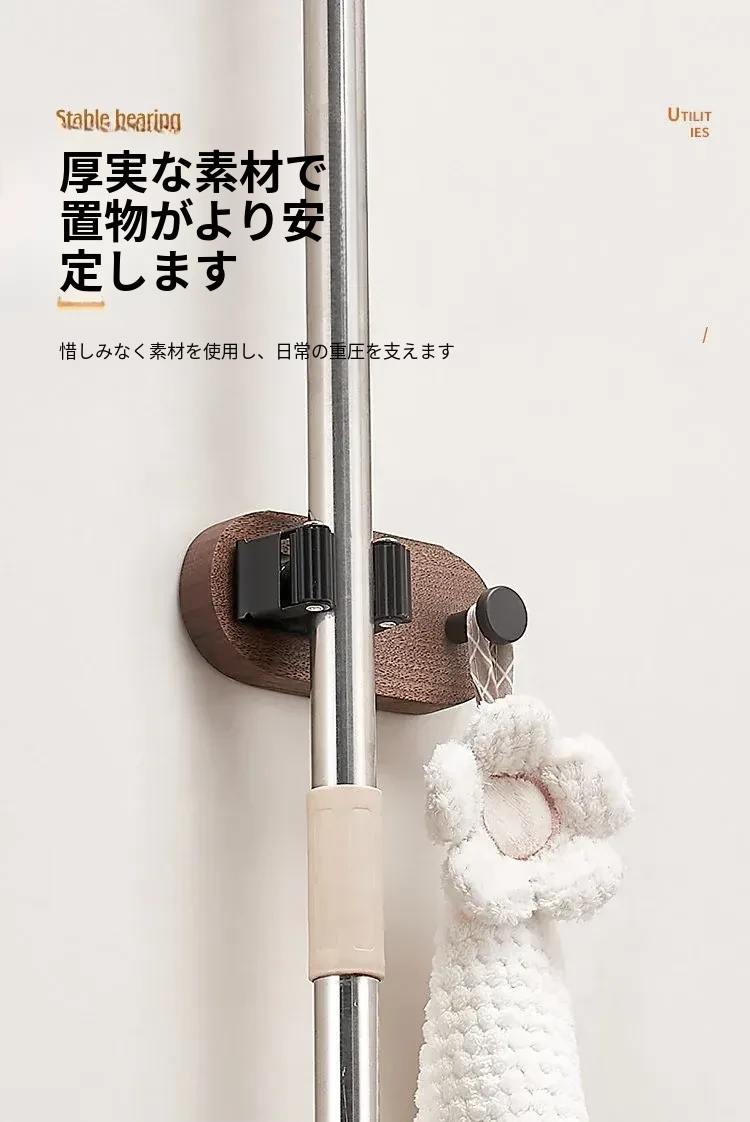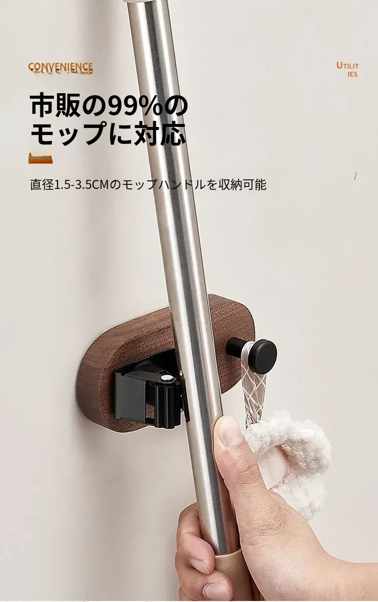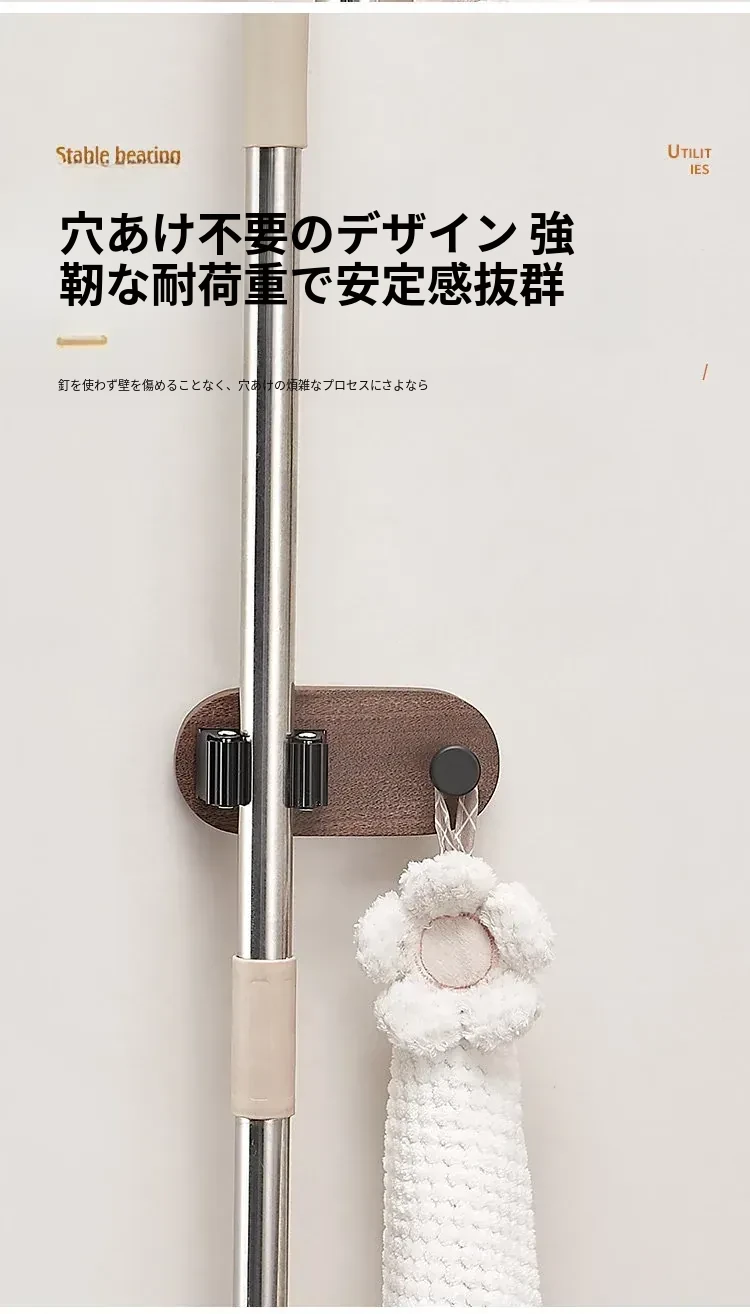 トイレやキッチンに最適!穴なしで簡単取り付け、強力粘着のモップハンガー!お掃除用具をスッキリ収納できる便利なドラッグフック。