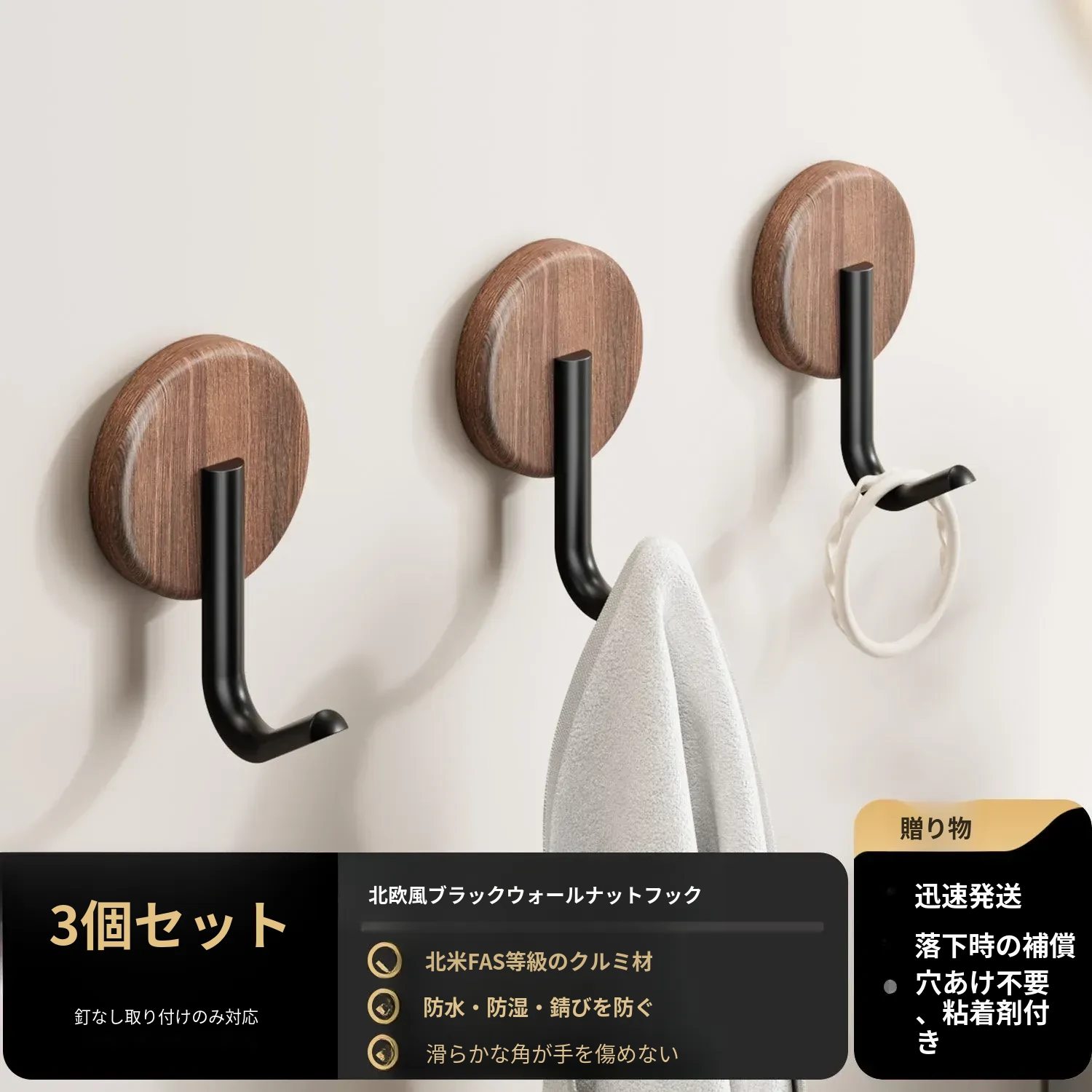 ブラックウォールナット木-Jフック3個セット ✅無垢材+無臭