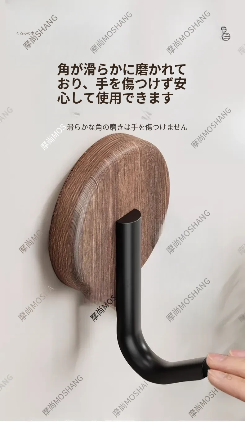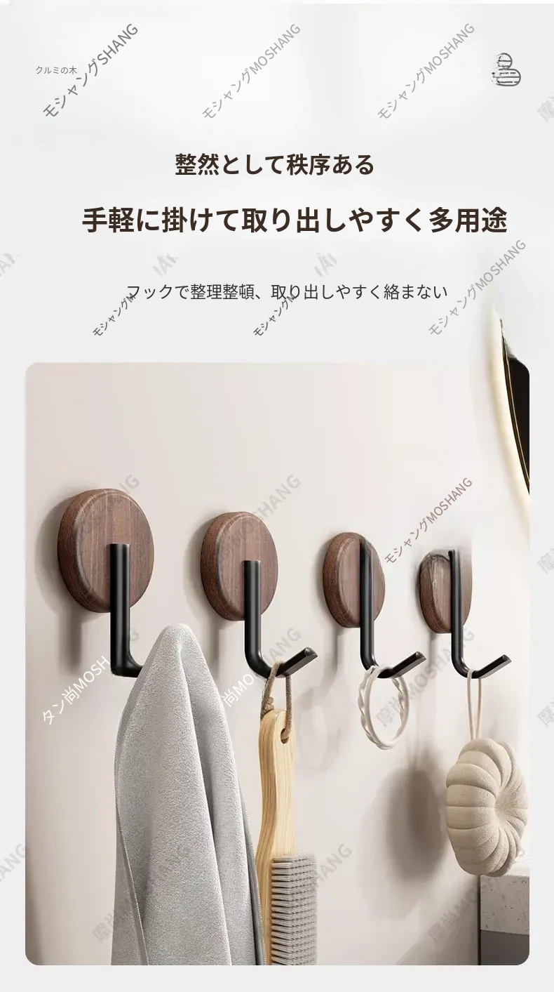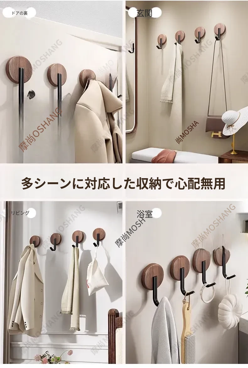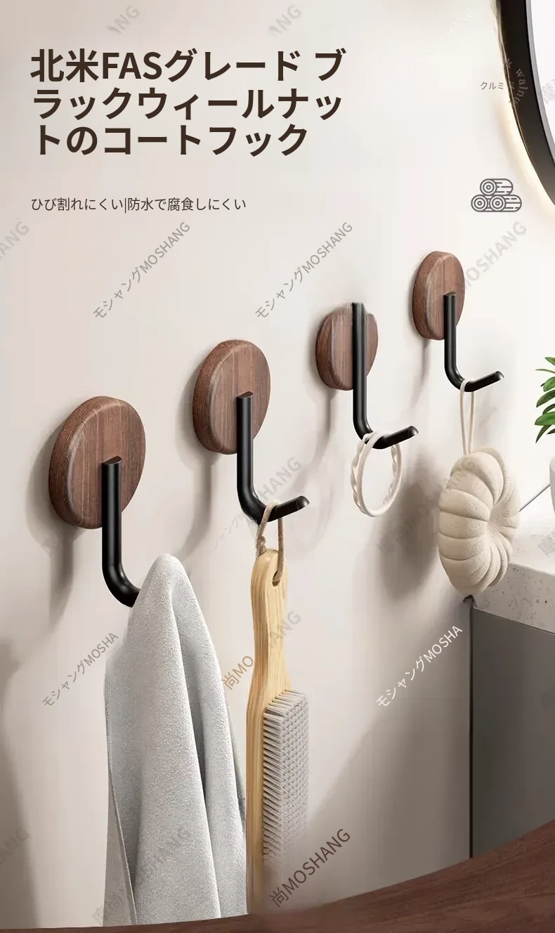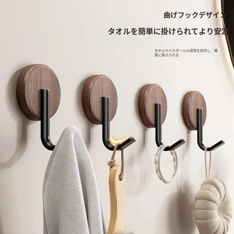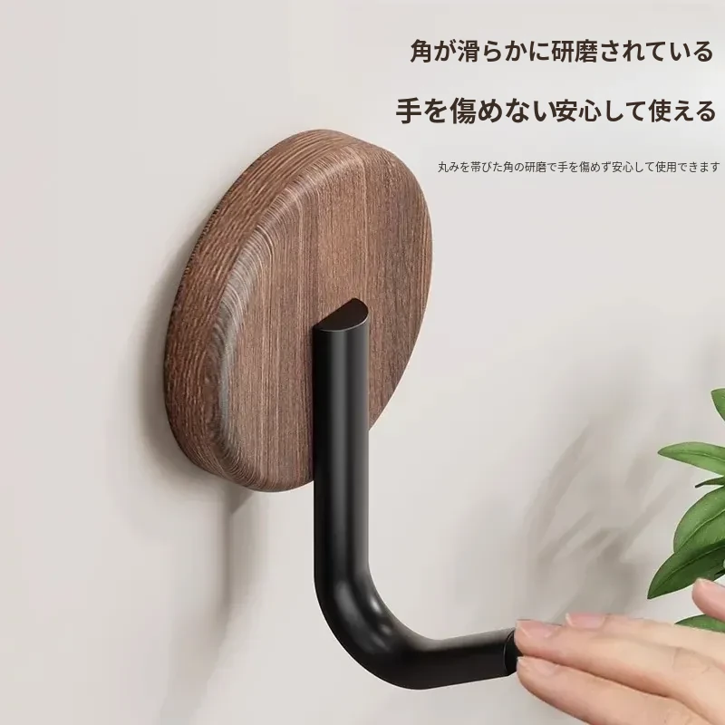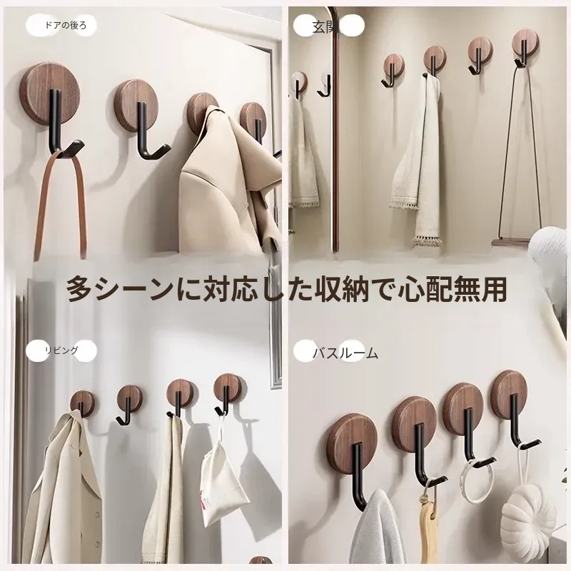 ウォールフック 胡桃木製 強力粘着 無孔取り付け 玄関・入居後の壁に最適!コートや帽子をおしゃれに収納できるデザインフック