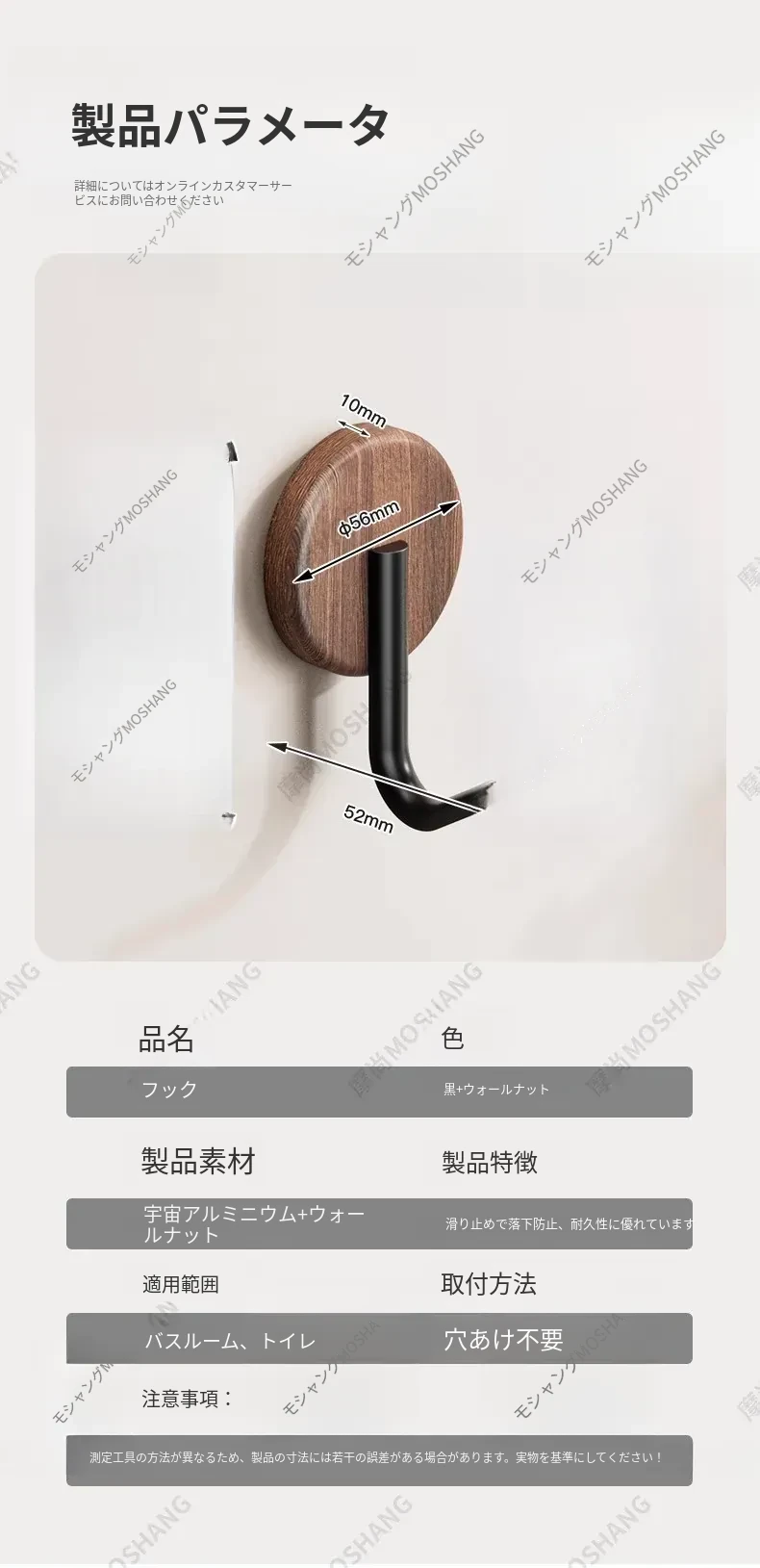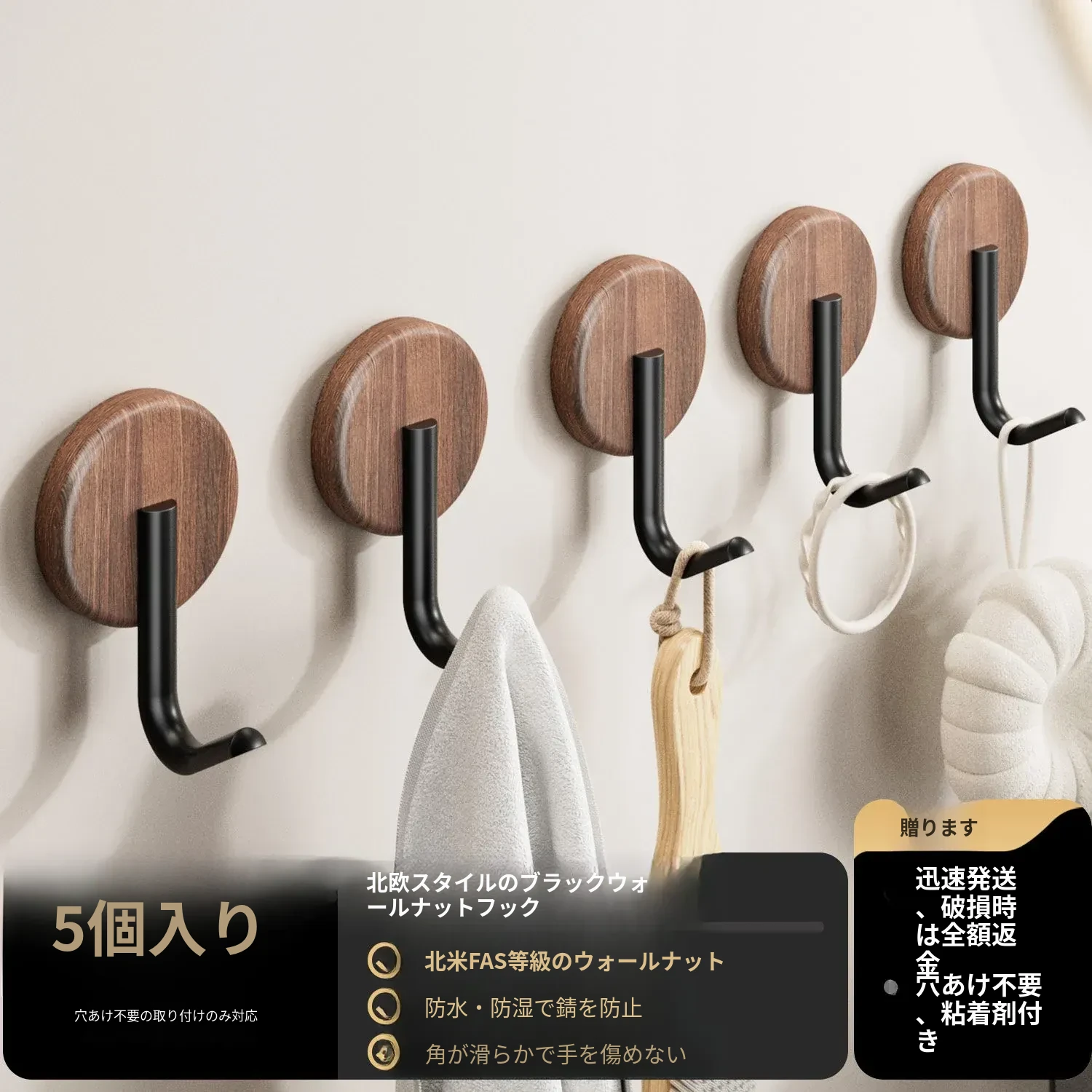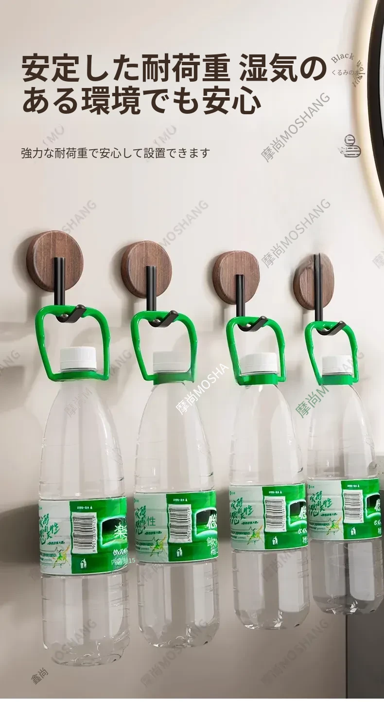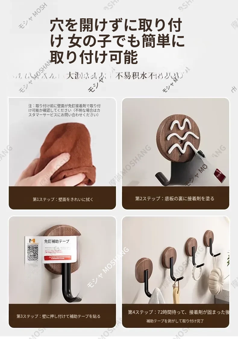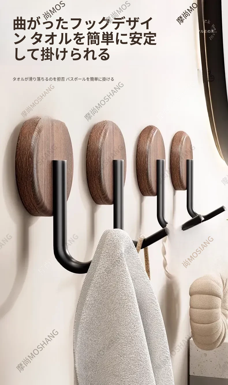 ウォールフック 胡桃木製 強力粘着 無孔取り付け 玄関・入居後の壁に最適!コートや帽子をおしゃれに収納できるデザインフック