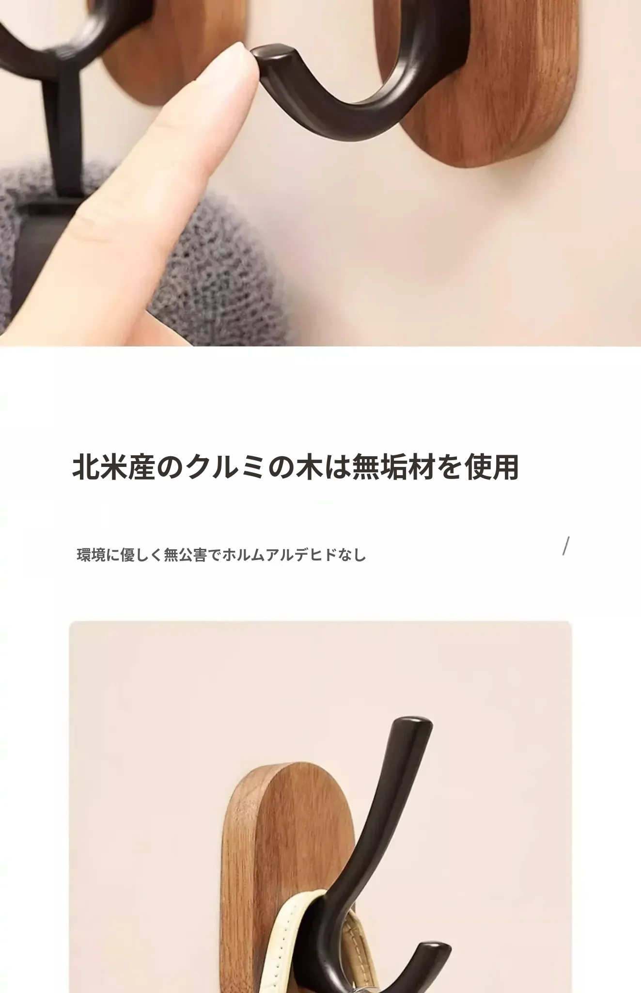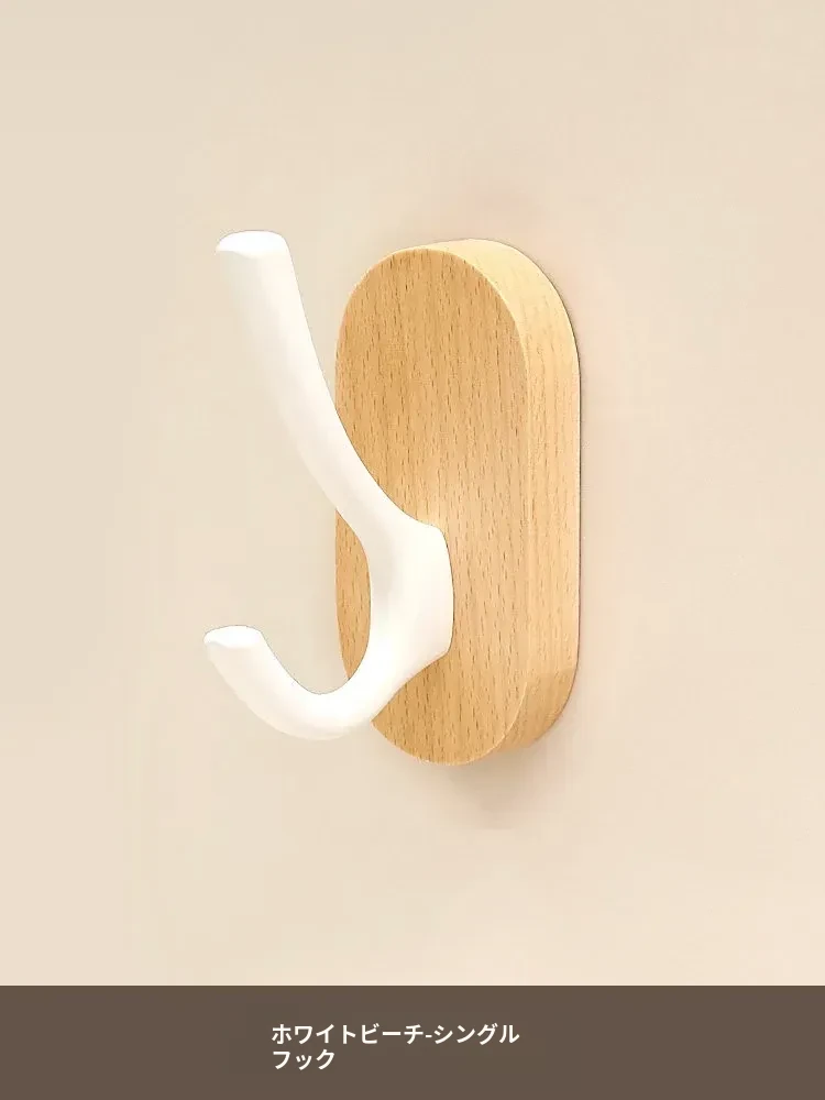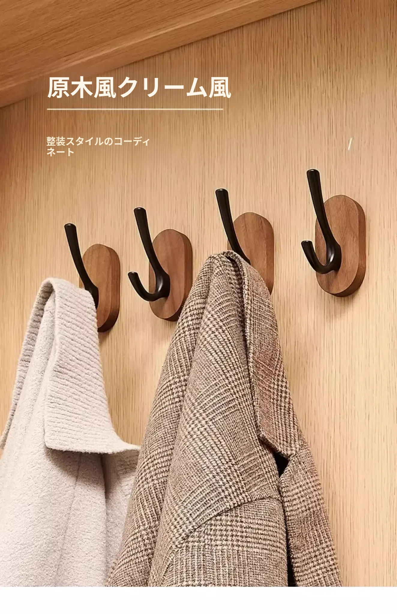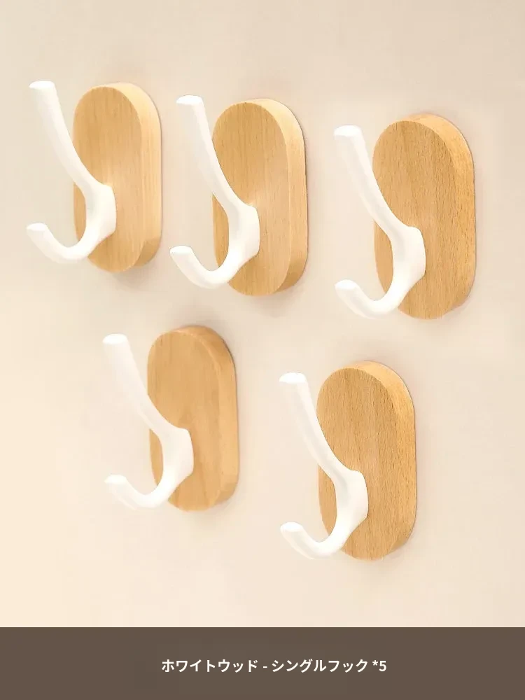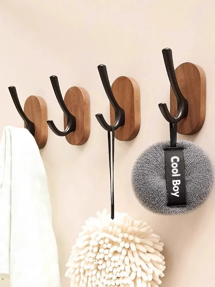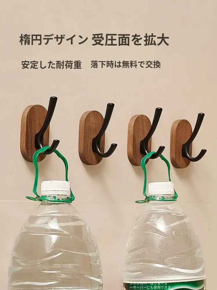ウォールマウントフック - 強力な接着剤で取り付け簡単!クルミの木製コートフック、穴あけ不要でバスルームや玄関に最適。衣類をしっかりと支え、美しいデザインでお部屋をおしゃれに演出。