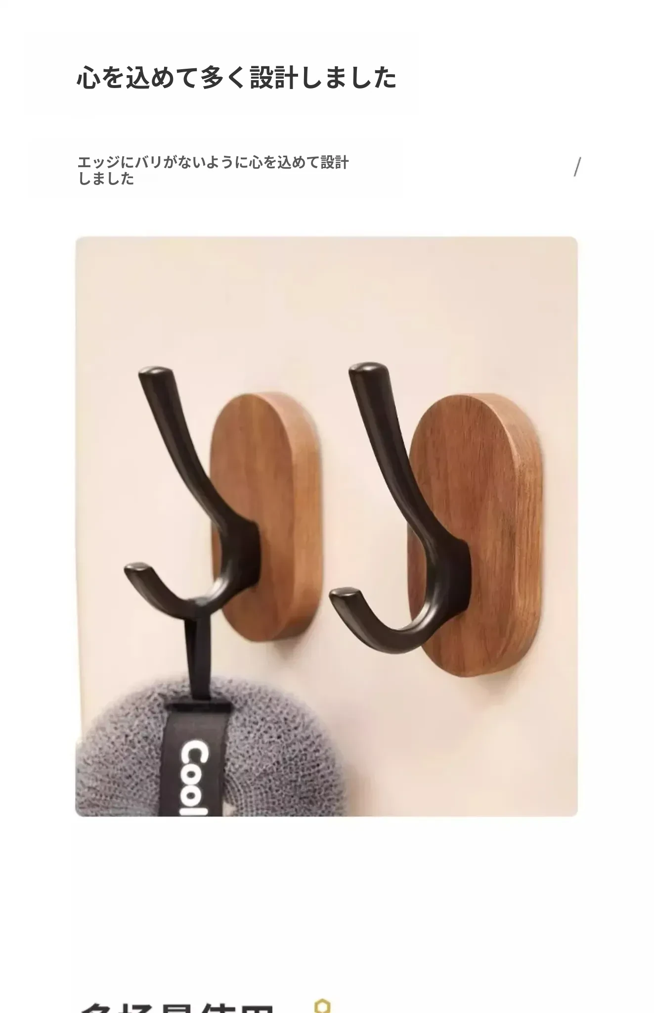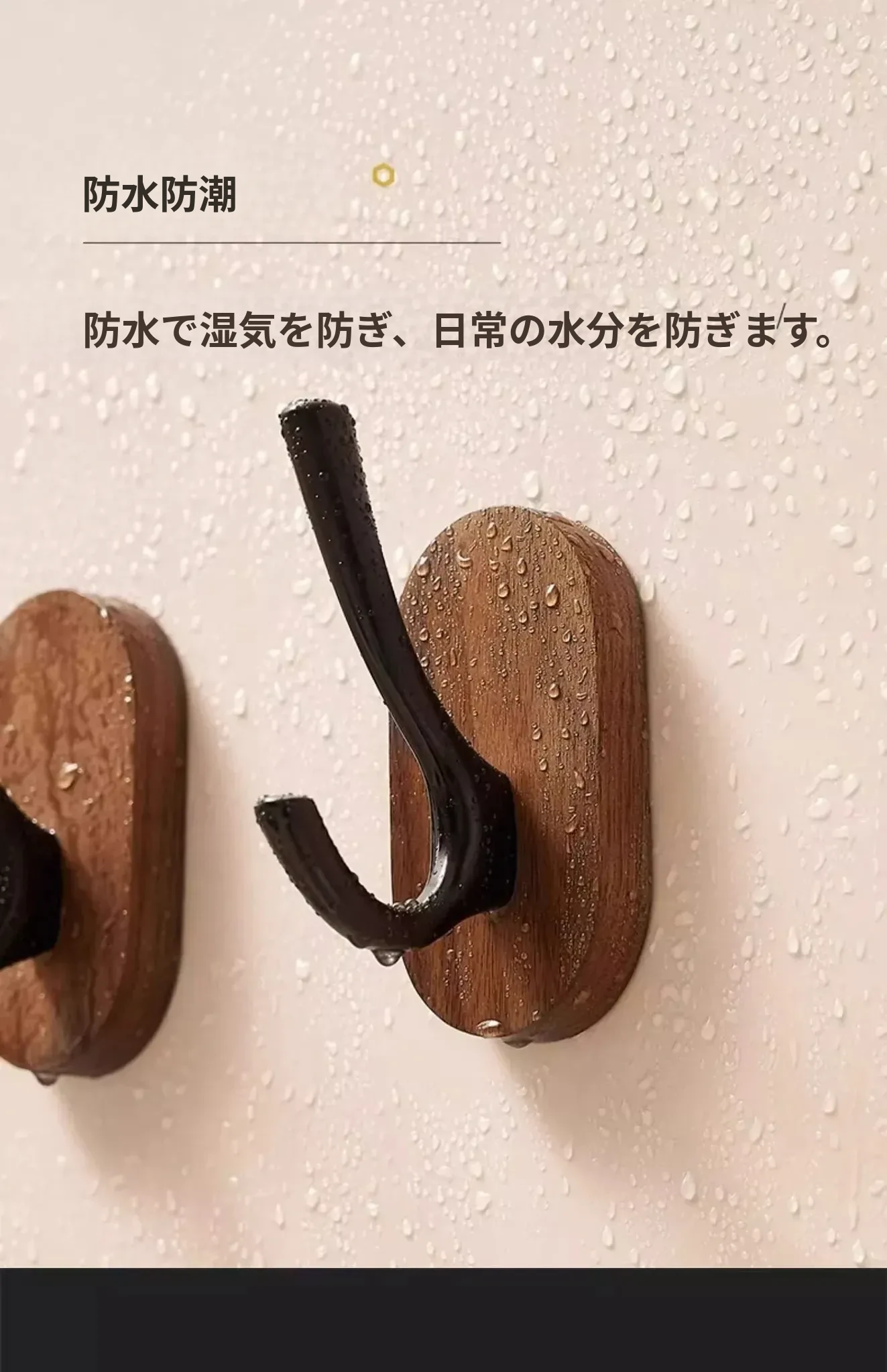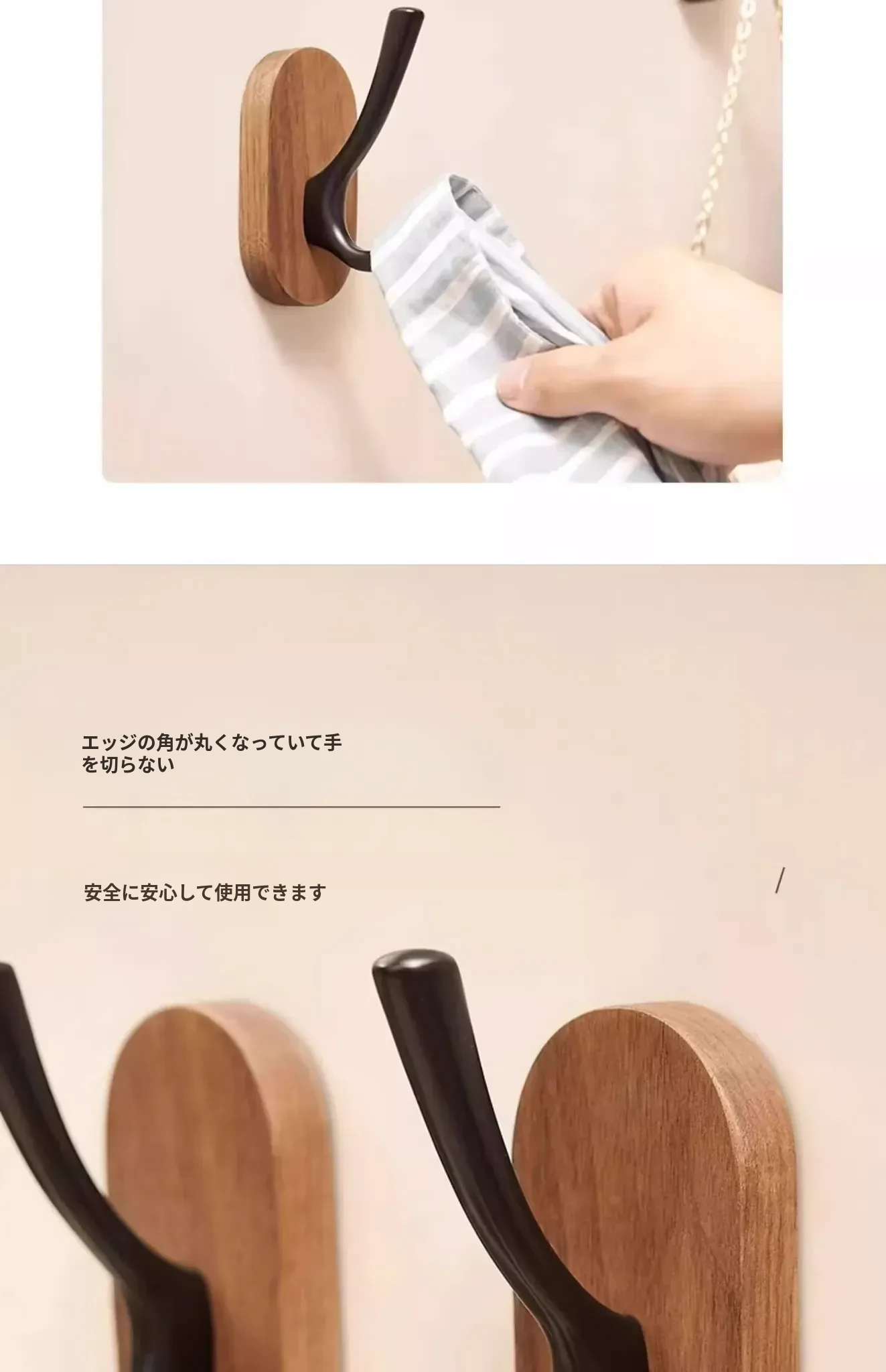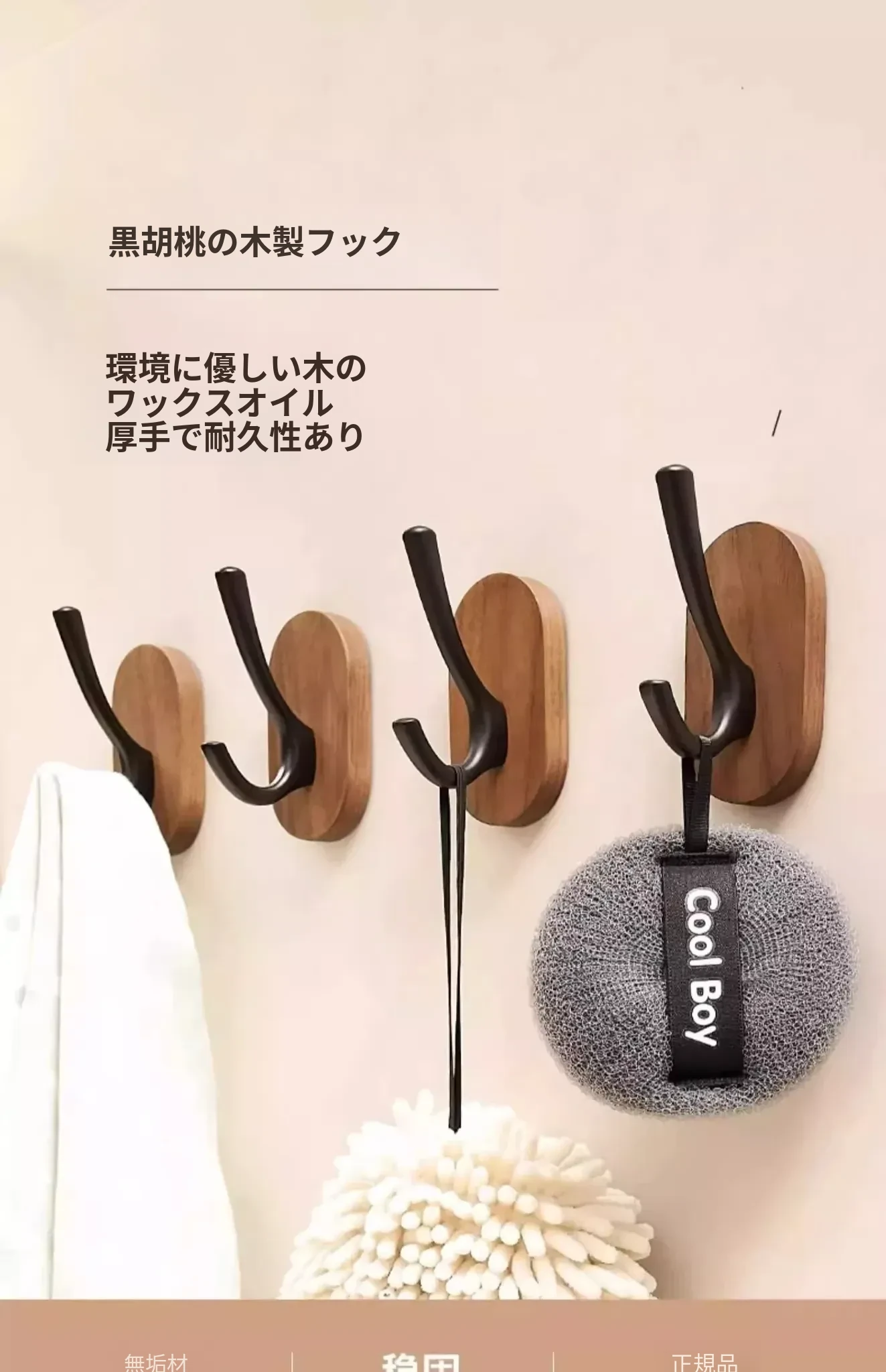 ウォールマウントフック - 強力な接着剤で取り付け簡単!クルミの木製コートフック、穴あけ不要でバスルームや玄関に最適。衣類をしっかりと支え、美しいデザインでお部屋をおしゃれに演出。