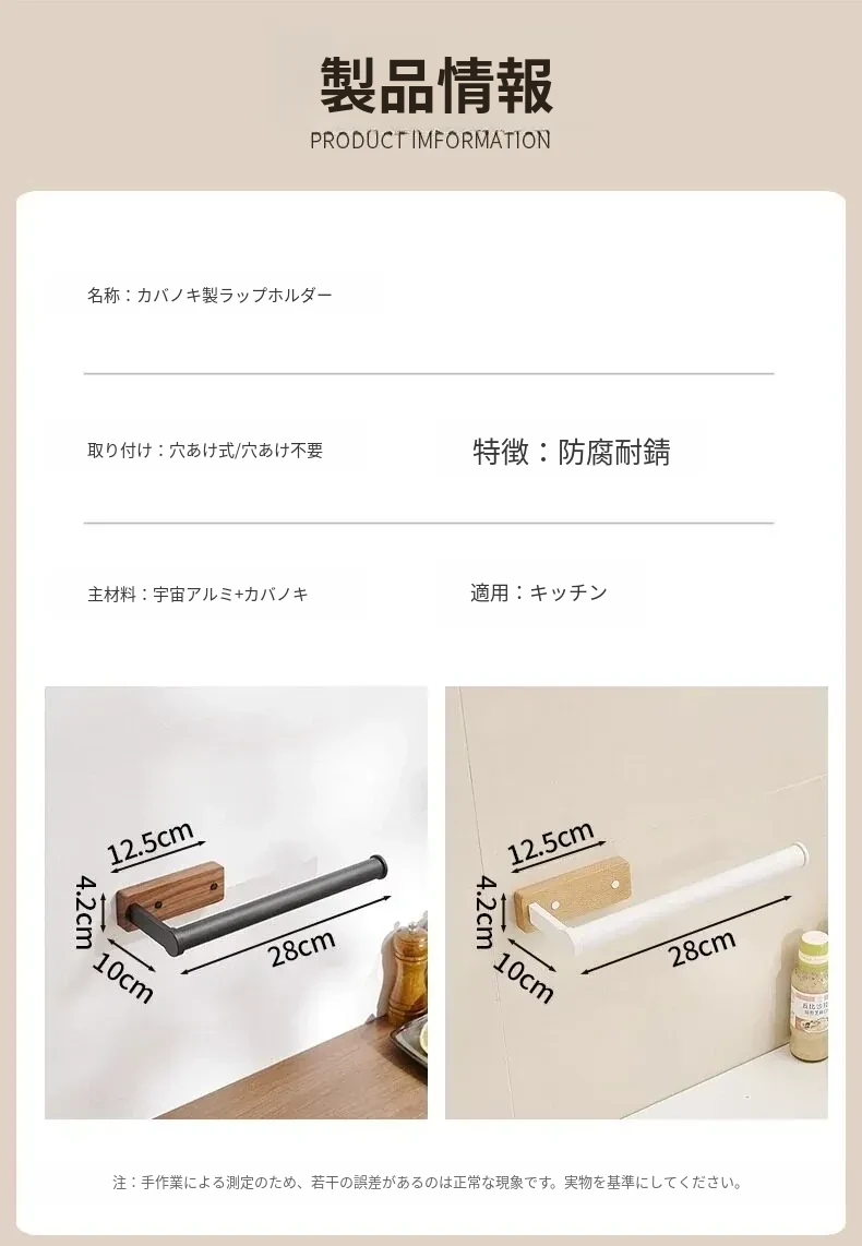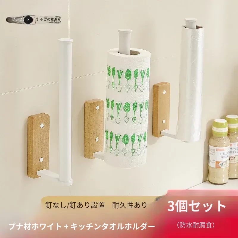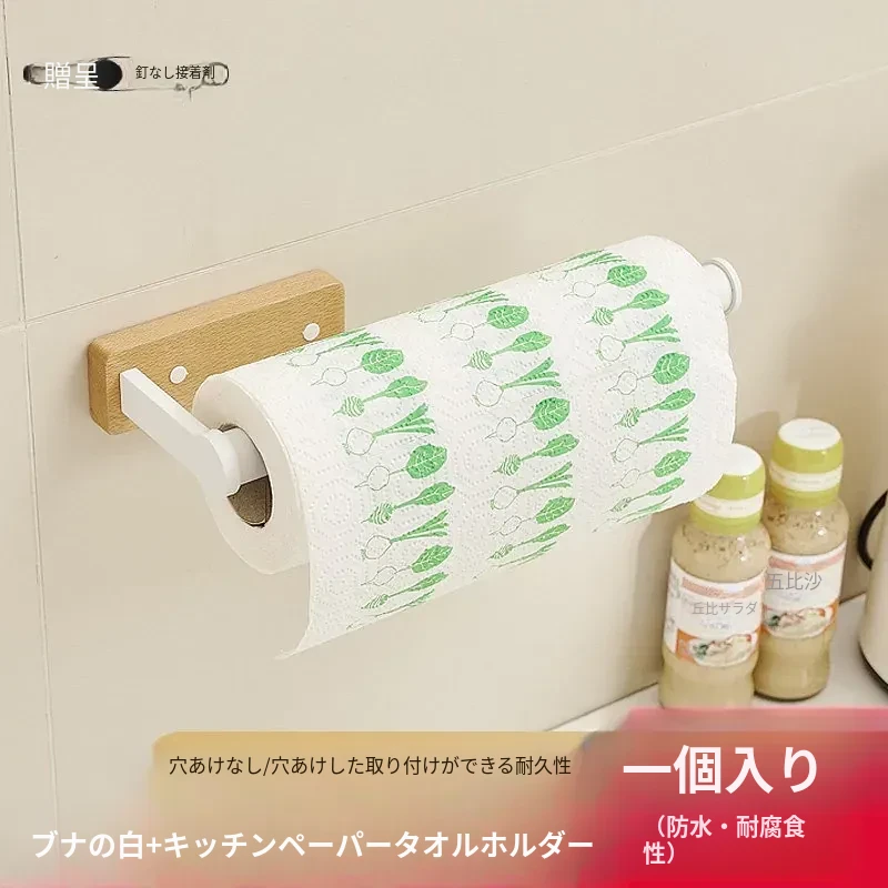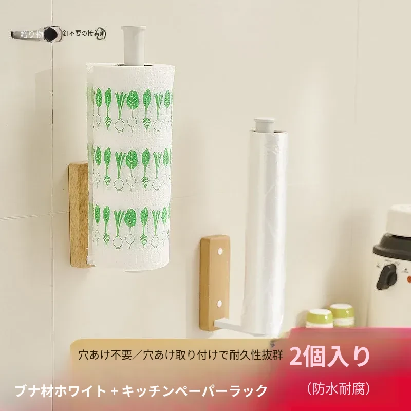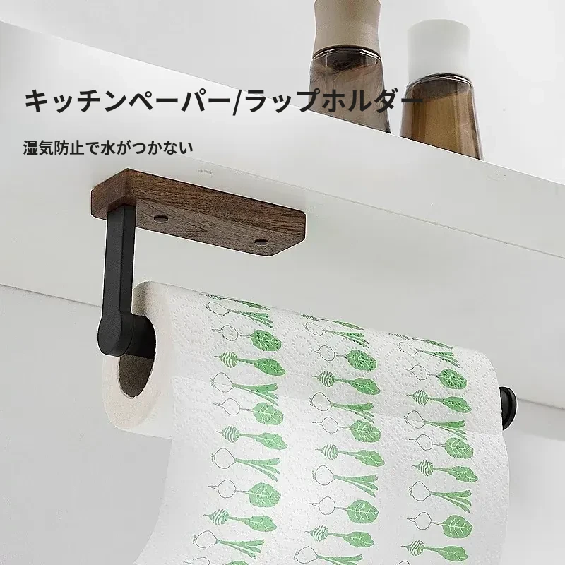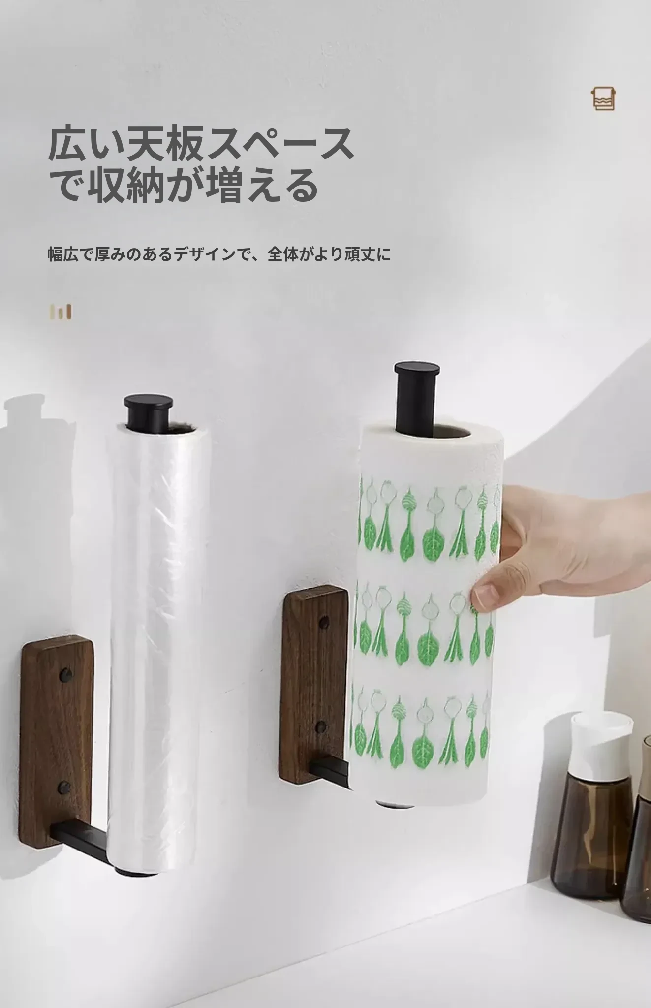 キッチンペーパー専用ホルダー|ラップや袋も収納可能!おしゃれなナチュラルウッドデザインで、穴あけ不要の簡単取り付け。便利でスタイリッシュな収納を実現!