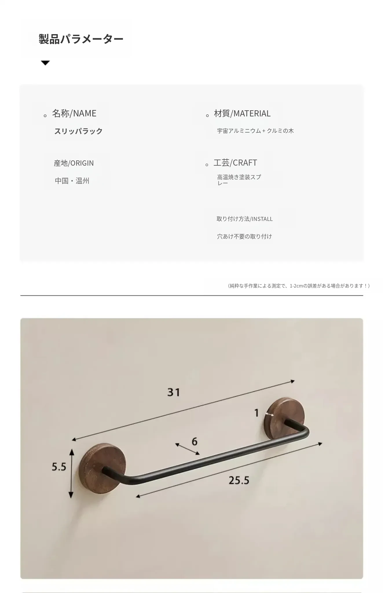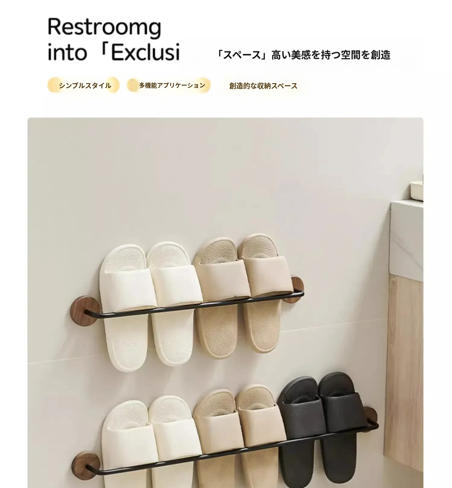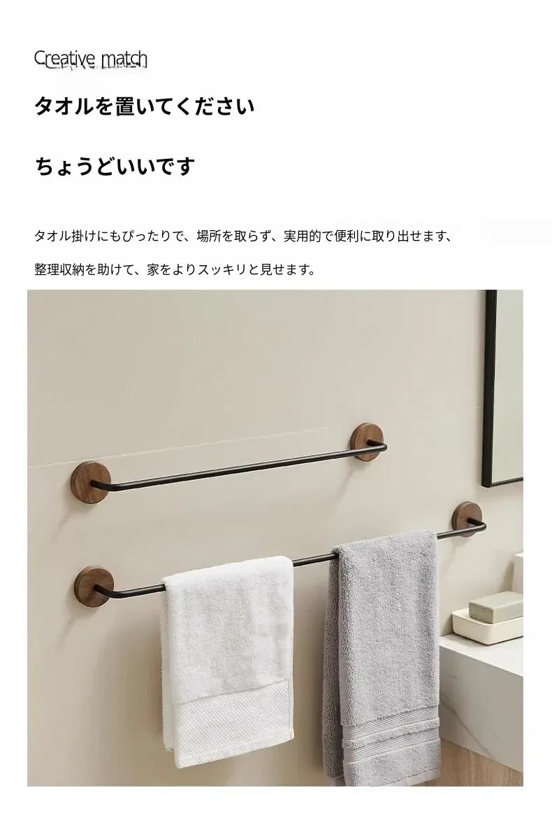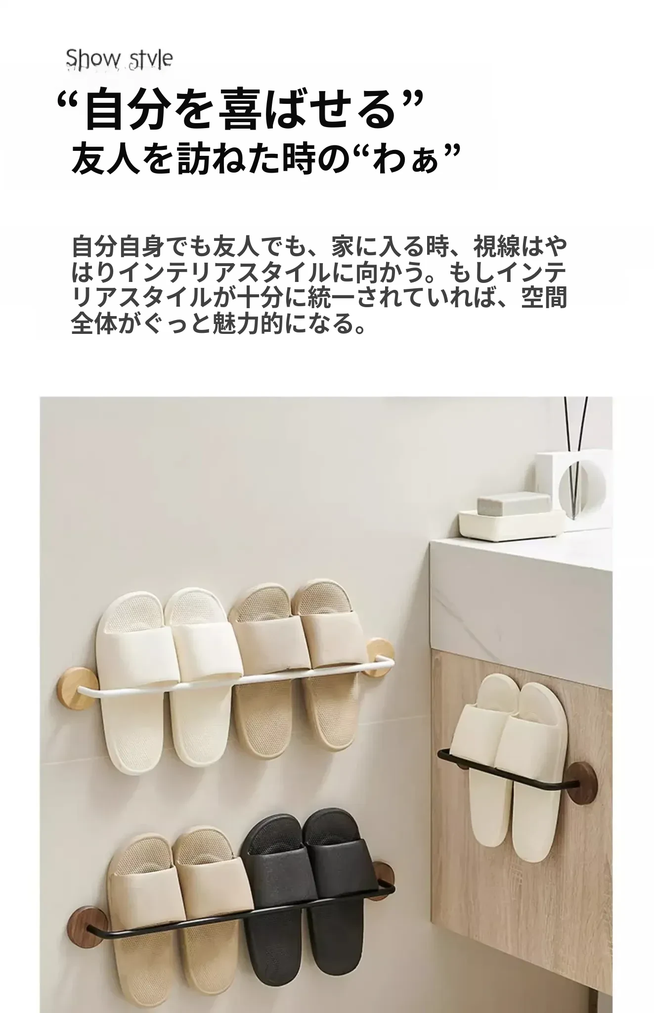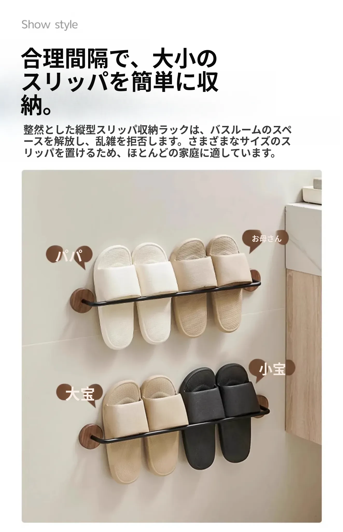 ウォールマウント式のくるみ材バススリッパラック - 穴あけ不要、トイレや洗面所の靴収納に最適!便利でスタイリッシュなドア裏収納ラック。