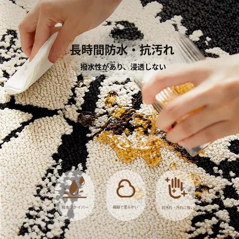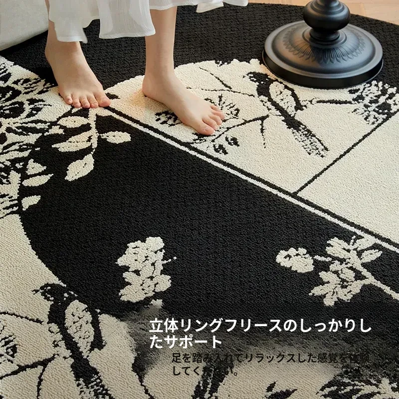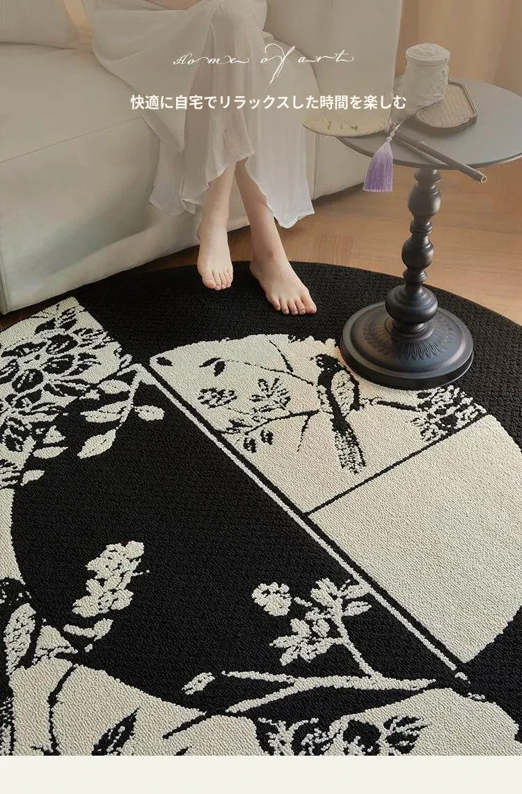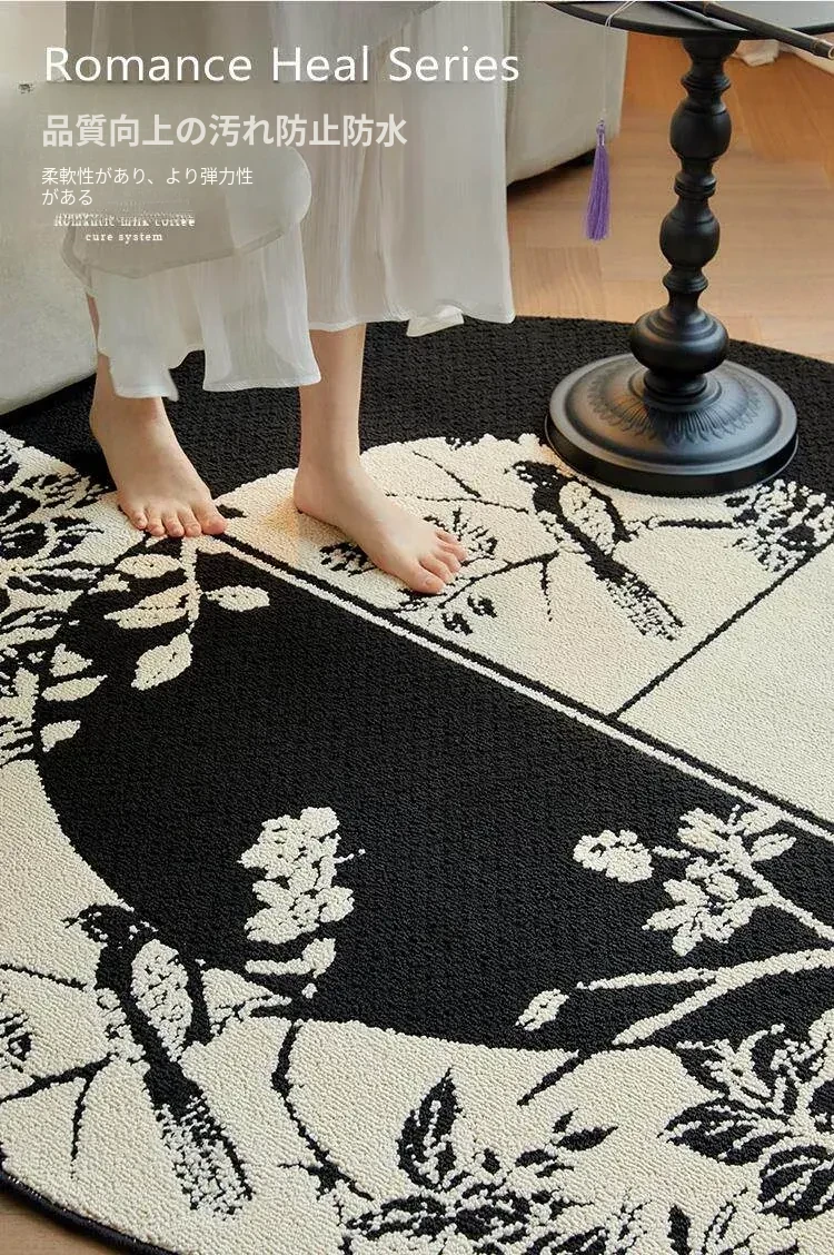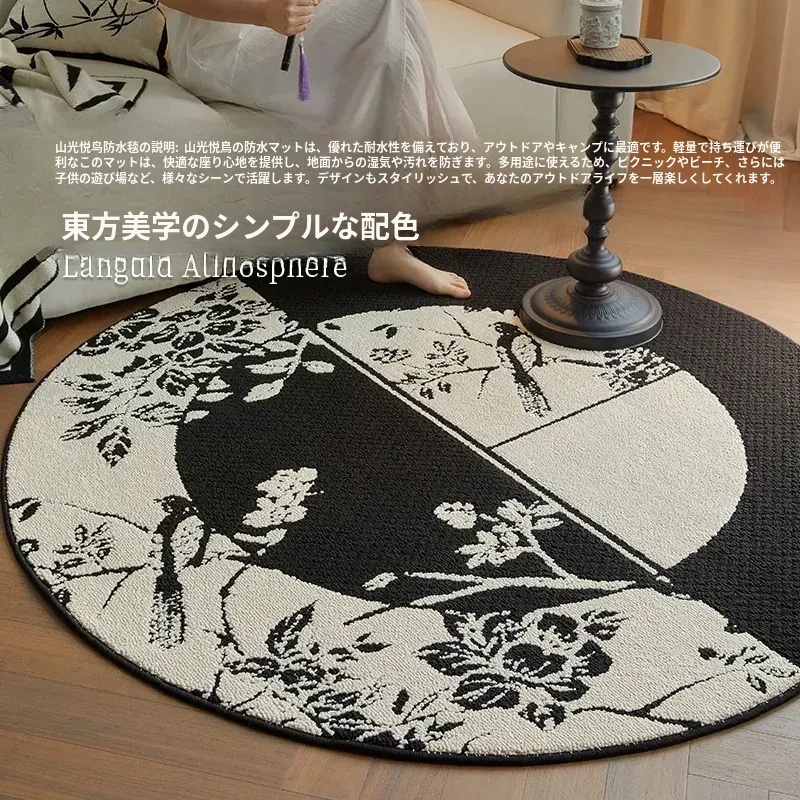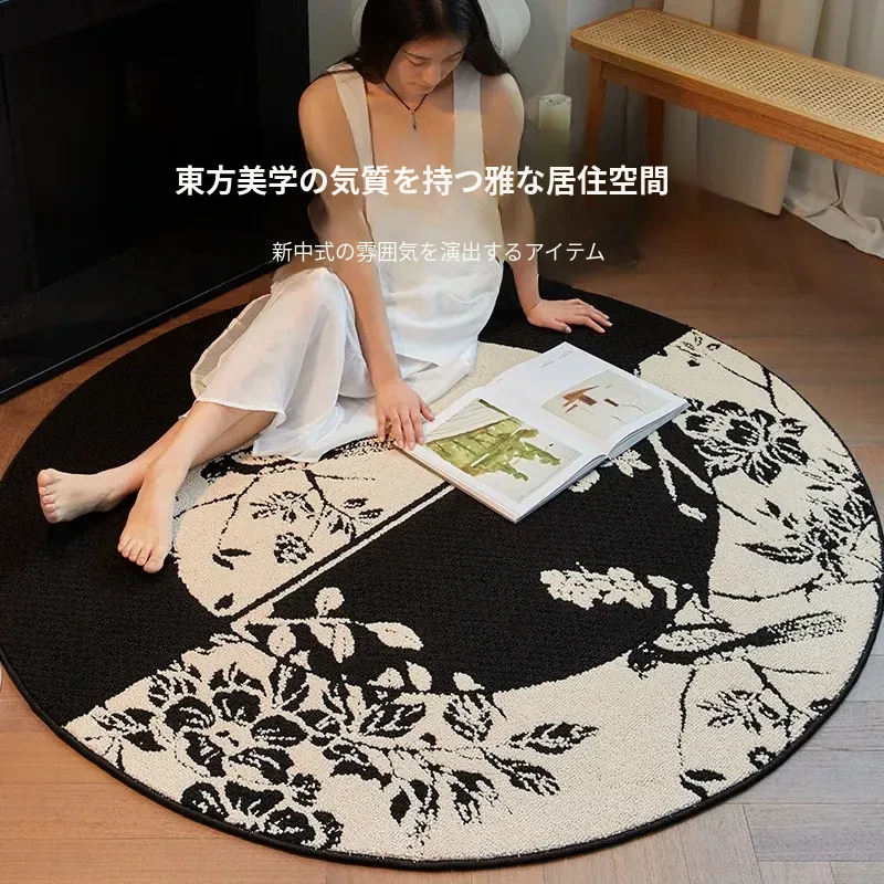 防水・防汚!新中式デザインの黒白円形レトロラグ。リビング、ベッドサイド、ソファやテーブルに最適。汚れにくく、手間いらずのお手入れで快適な空間を演出!