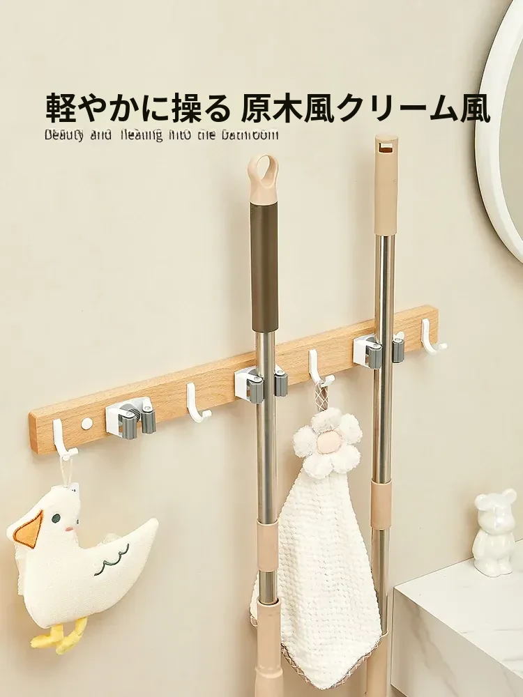 穴あけ不要!強力粘着フック付きモップ壁掛け収納ラック - おしゃれな無垢材仕様で、トイレやお風呂の掃除道具をすっきり整理!掃除も楽々、スペースを有効活用!